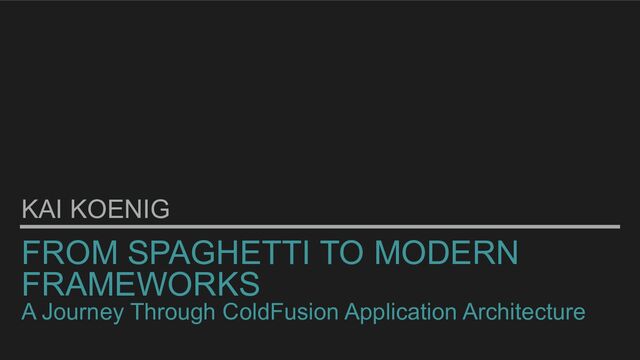 I've been working with CFML for the better part of 25 years now. Over this time, we've come a long way in how applications in ColdFusion are being written. This is a somewhat lighthearted, yet technically insightful trip down memory lane as we explore the evolution of ColdFusion application architectures and frameworks.