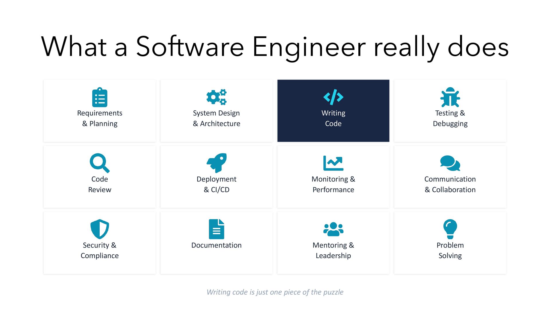 Design & Architecture Writing Code Testing & Debugging Code Review Deployment & CI/CD Monitoring & Performance Communication & Collaboration Security & Compliance Documentation Mentoring & Leadership Problem Solving Writing code is just one piece of the puzzle