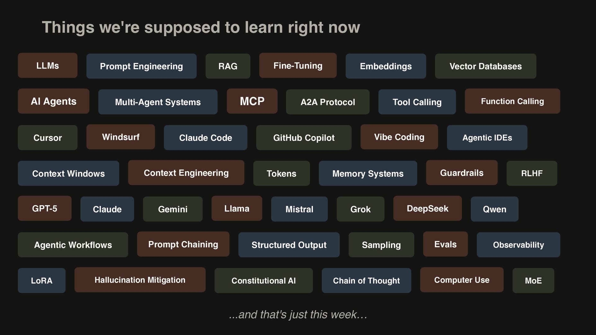 Multi-Agent Systems Tool Calling Claude Code Agentic IDEs Context Windows Memory Systems Claude Mistral Qwen Structured Output Observability LoRA Chain of Thought LLMs Fine-Tuning AI Agents MCP Function Calling Windsurf Vibe Coding Context Engineering Guardrails GPT-5 Llama DeepSeek Prompt Chaining Evals Hallucination Mitigation Computer Use RAG Vector Databases A2A Protocol Cursor GitHub Copilot Tokens RLHF Gemini Grok Agentic Workflows Sampling Constitutional AI MoE ...and that's just this week…