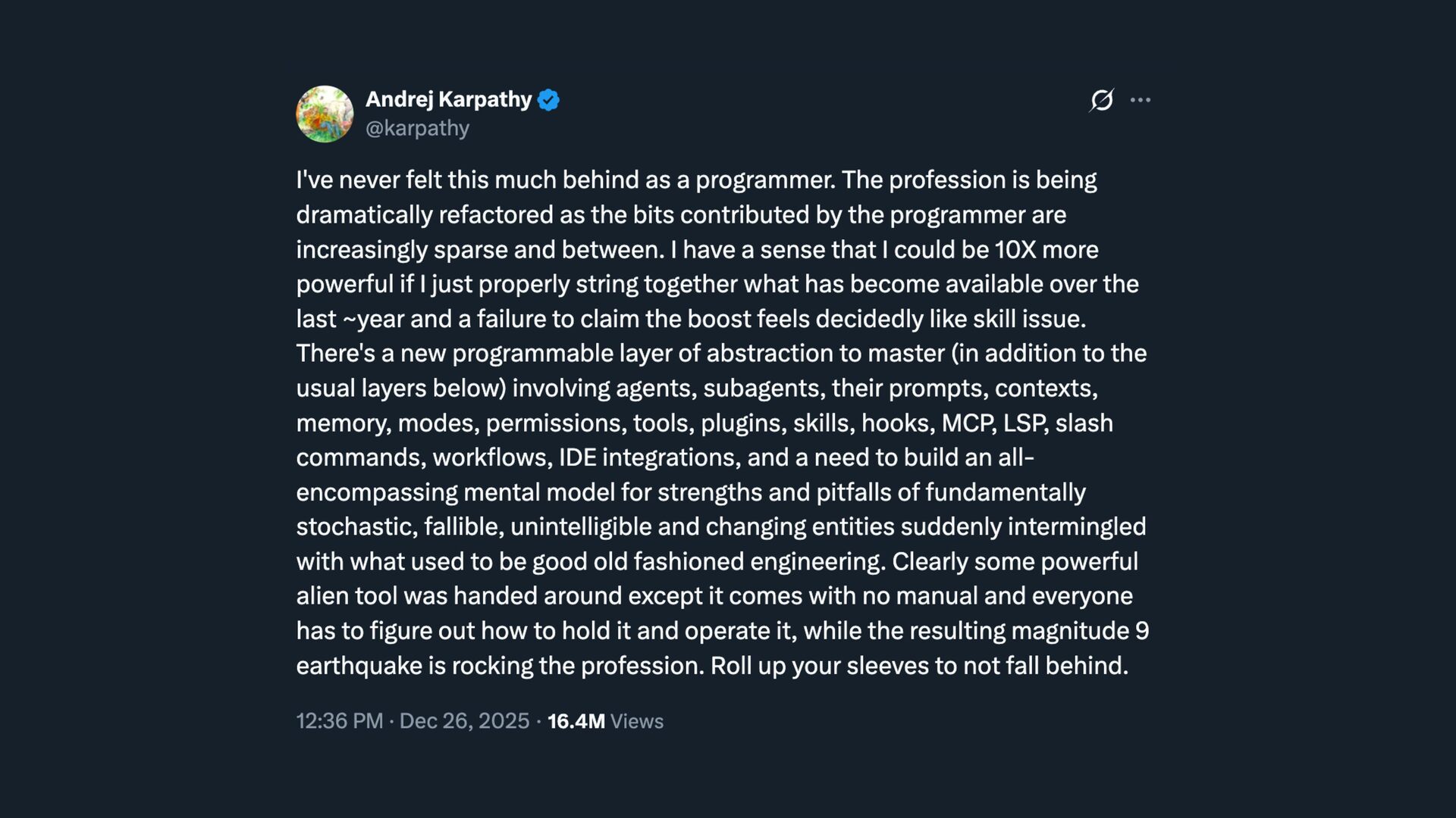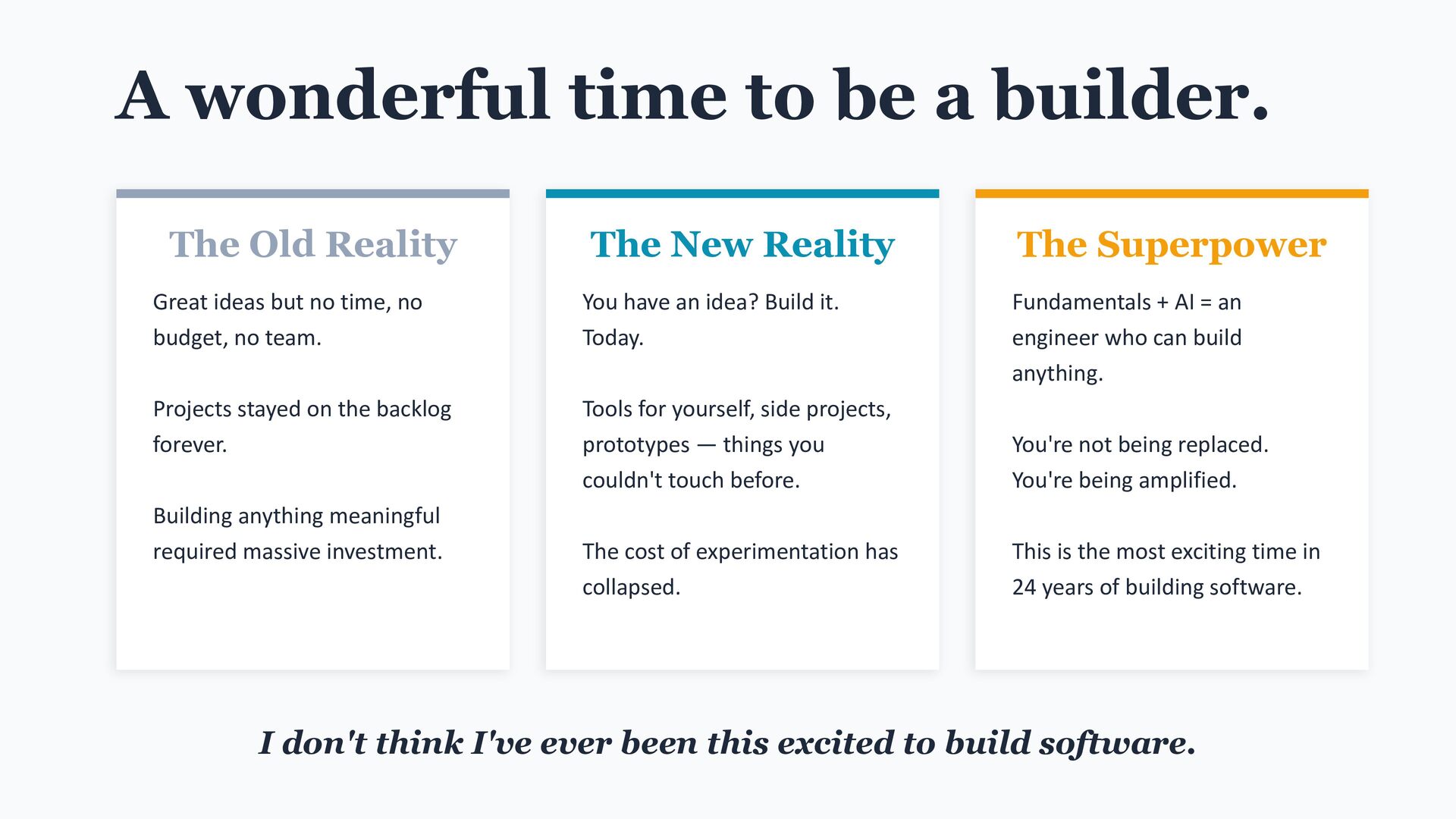 Great ideas but no time, no budget, no team. Projects stayed on the backlog forever. Building anything meaningful required massive investment. The New Reality You have an idea? Build it. Today. Tools for yourself, side projects, prototypes — things you couldn't touch before. The cost of experimentation has collapsed. The Superpower Fundamentals + AI = an engineer who can build anything. You're not being replaced. You're being amplified. This is the most exciting time in 24 years of building software. I don't think I've ever been this excited to build software.