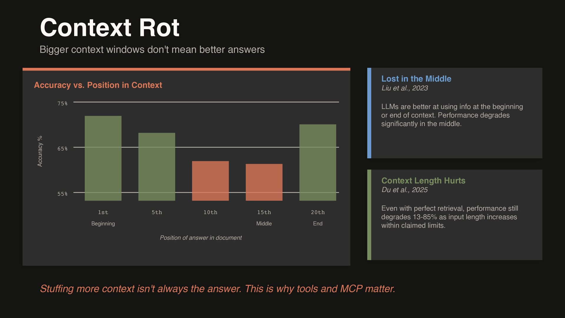 vs. Position in Context Accuracy % 75% 65% 55% 1st Beginning 5th 10th 15th Middle 20th End Position of answer in document Lost in the Middle Liu et al., 2023 LLMs are better at using info at the beginning or end of context. Performance degrades significantly in the middle. Context Length Hurts Du et al., 2025 Even with perfect retrieval, performance still degrades 13-85% as input length increases within claimed limits. Stuffing more context isn't always the answer. This is why tools and MCP matter.