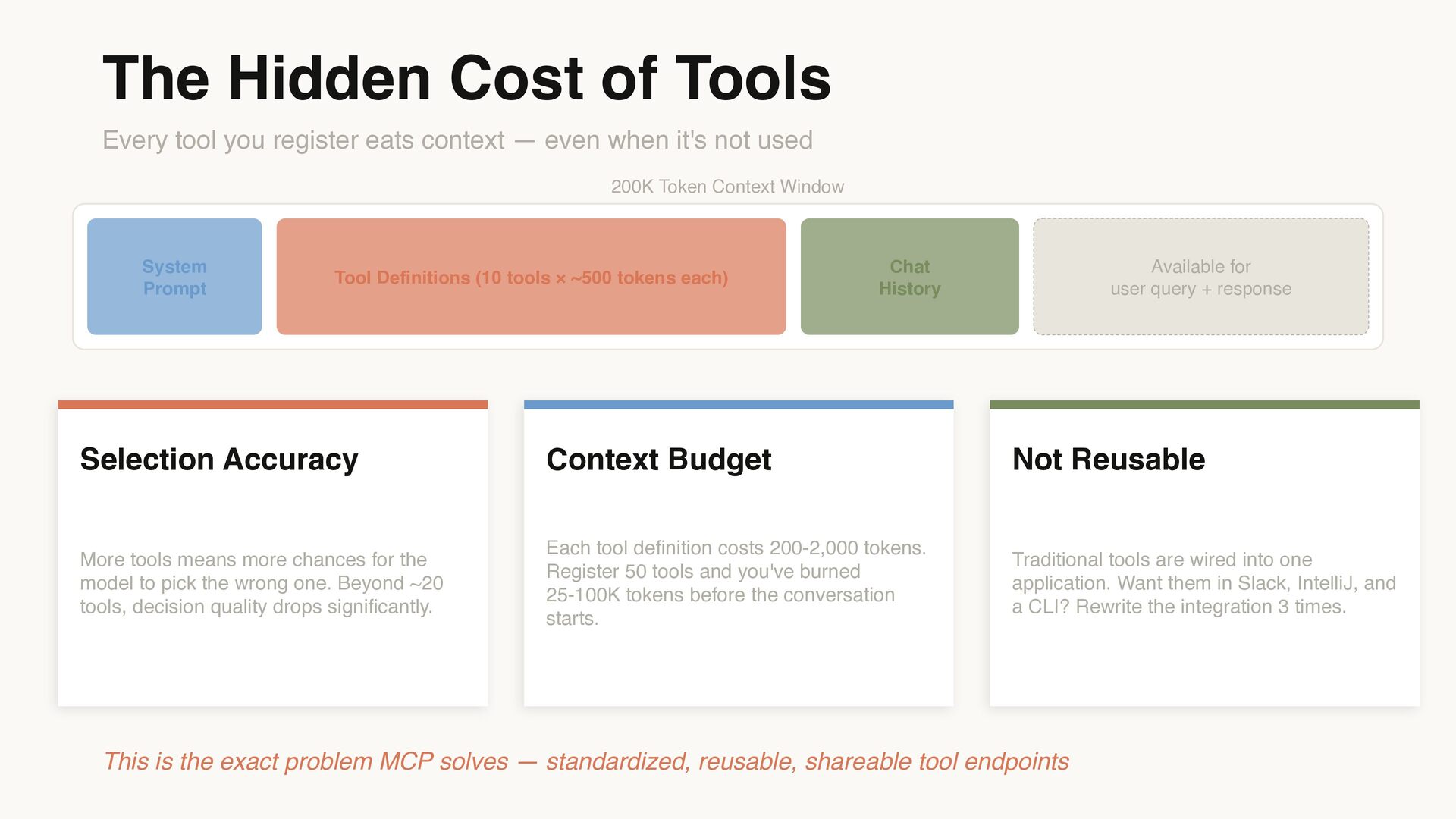 context — even when it's not used 200K Token Context Window System Prompt Tool Definitions (10 tools × ~500 tokens each) Chat History Available for user query + response Selection Accuracy More tools means more chances for the model to pick the wrong one. Beyond ~20 tools, decision quality drops significantly. Context Budget Each tool definition costs 200-2,000 tokens. Register 50 tools and you've burned 25-100K tokens before the conversation starts. Not Reusable Traditional tools are wired into one application. Want them in Slack, IntelliJ, and a CLI? Rewrite the integration 3 times. This is the exact problem MCP solves — standardized, reusable, shareable tool endpoints