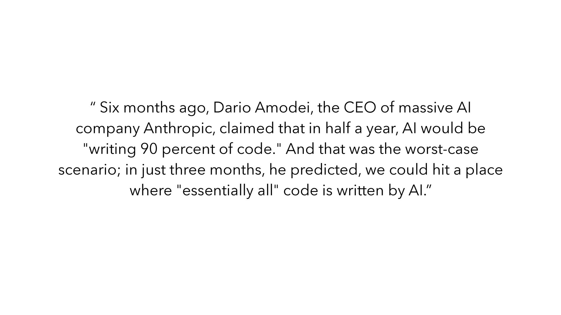 AI company Anthropic, claimed that in half a year, AI would be "writing 90 percent of code." And that was the worst-case scenario; in just three months, he predicted, we could hit a place where "essentially all" code is written by AI.”