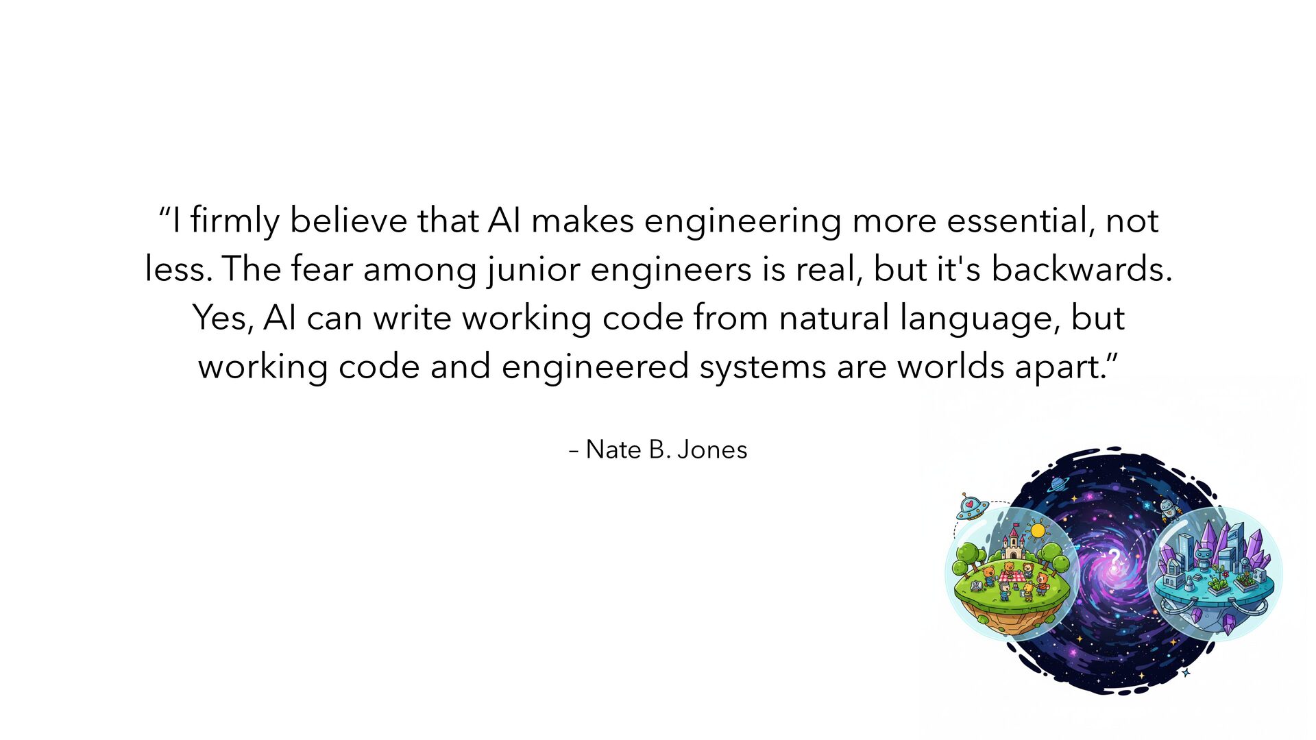 makes engineering more essential, not less. The fear among junior engineers is real, but it's backwards. Yes, AI can write working code from natural language, but working code and engineered systems are worlds apart.”
