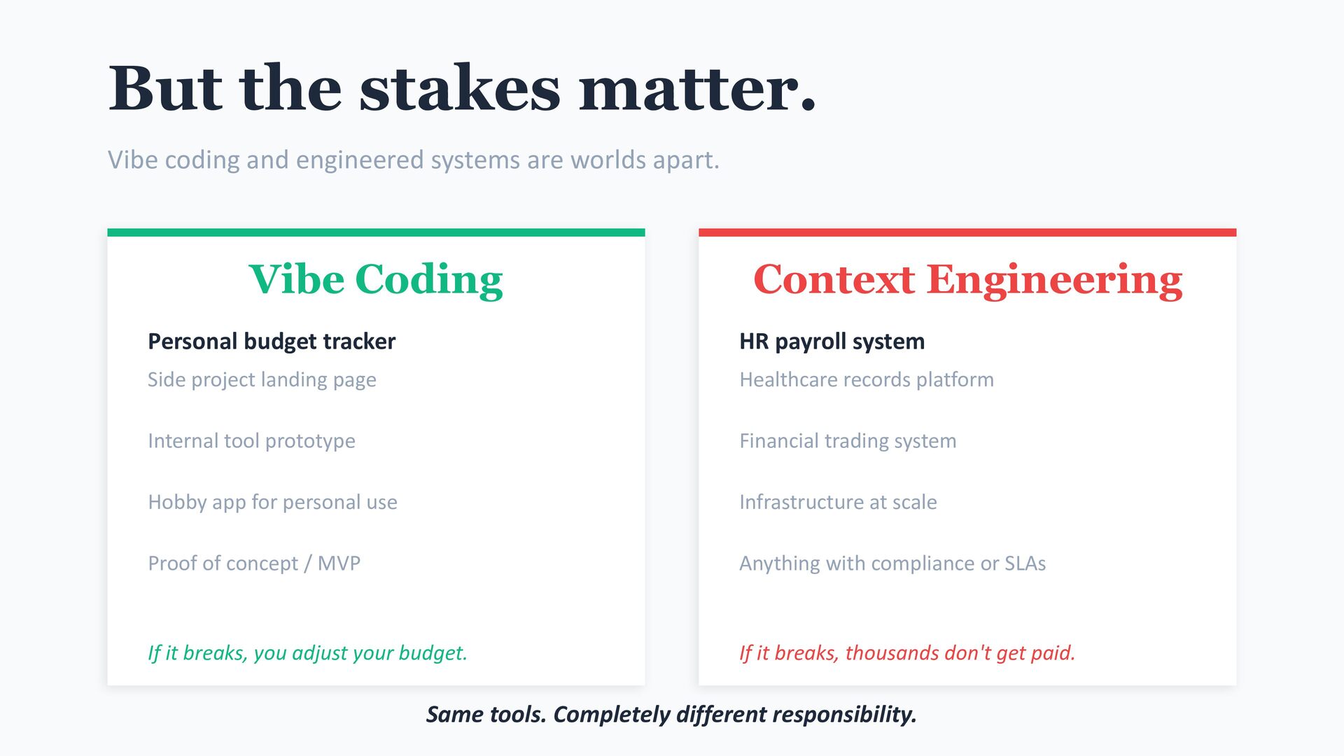 worlds apart. Vibe Coding Personal budget tracker Side project landing page Internal tool prototype Hobby app for personal use Proof of concept / MVP If it breaks, you adjust your budget. Context Engineering HR payroll system Healthcare records platform Financial trading system Infrastructure at scale Anything with compliance or SLAs If it breaks, thousands don't get paid. Same tools. Completely different responsibility.