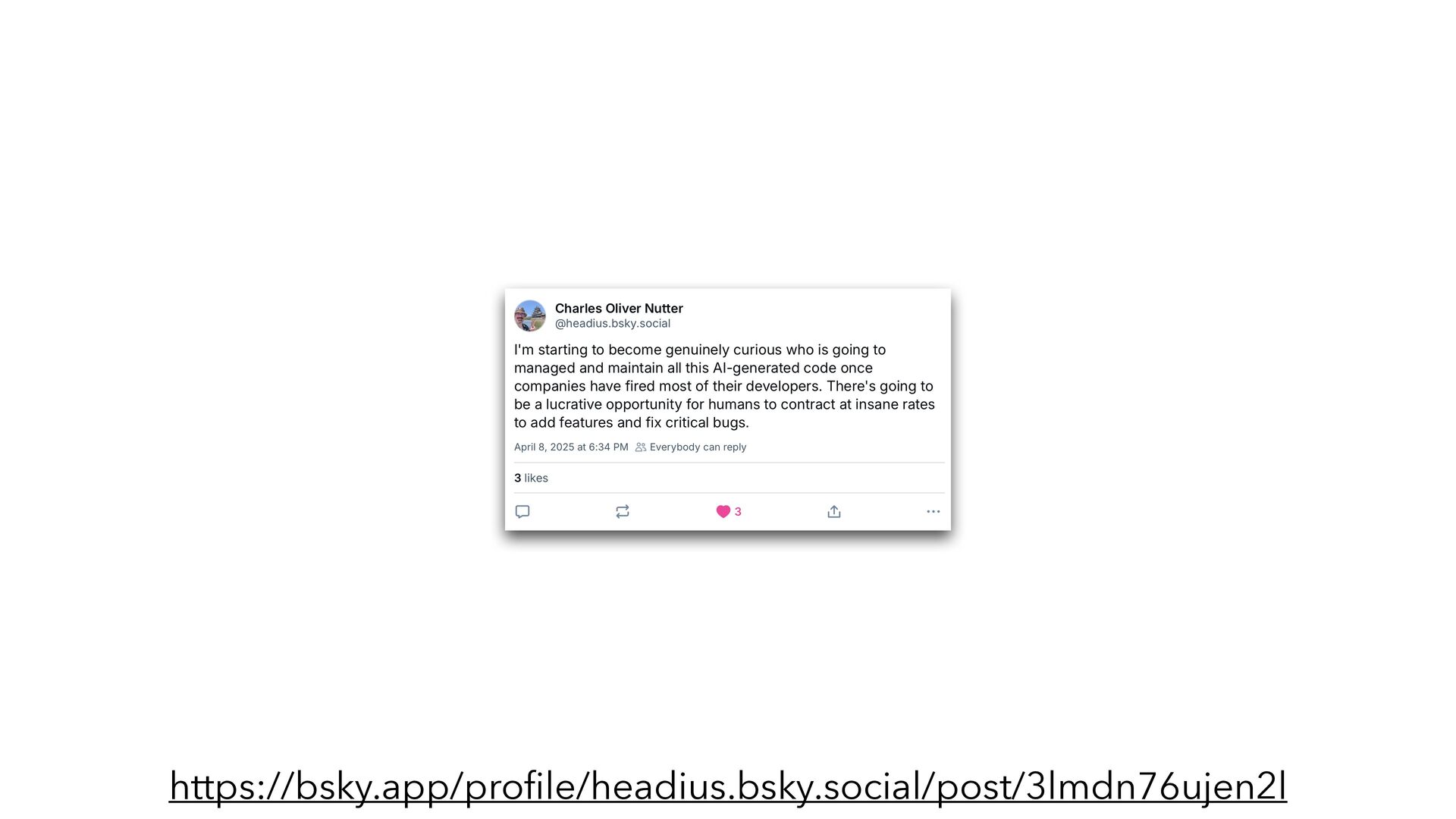 going to make developers obsolete. 2000s IDEs & code generators "Drag-and-drop will replace coding" 2010s Frameworks & low-code "Anyone can build an app now" 2018+ No-code platforms "Developers are the new buggy whip makers" 2023+ AI code assistants "Why learn to code at all?" Yet here we are.