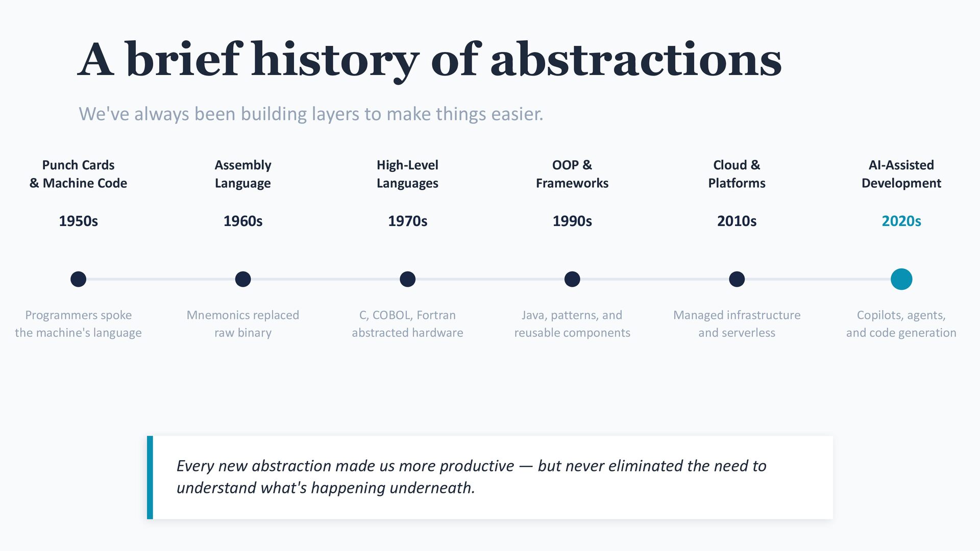 to make things easier. 1950s Punch Cards & Machine Code Programmers spoke the machine's language 1960s Assembly Language Mnemonics replaced raw binary 1970s High-Level Languages C, COBOL, Fortran abstracted hardware 1990s OOP & Frameworks Java, patterns, and reusable components 2010s Cloud & Platforms Managed infrastructure and serverless 2020s AI-Assisted Development Copilots, agents, and code generation Every new abstraction made us more productive — but never eliminated the need to understand what's happening underneath.