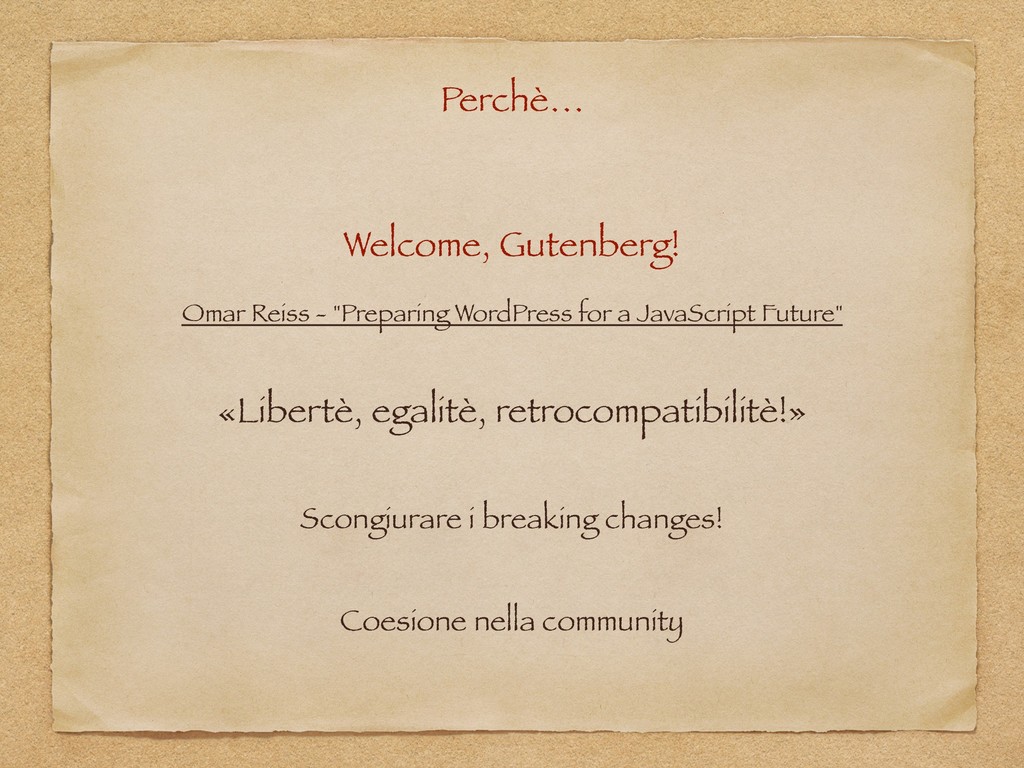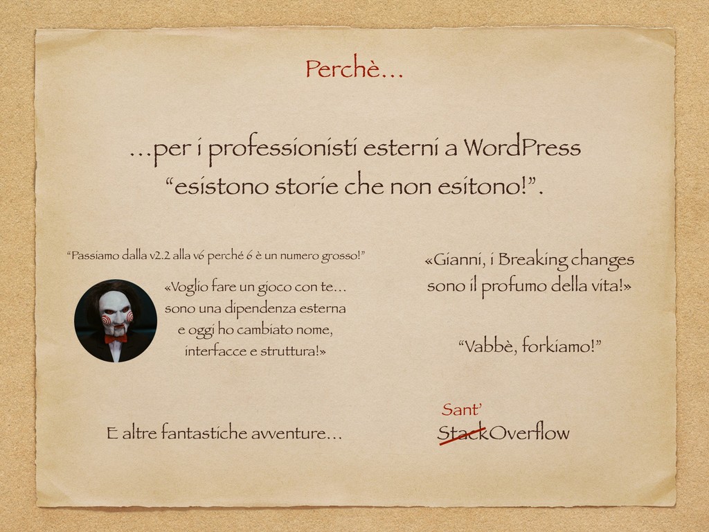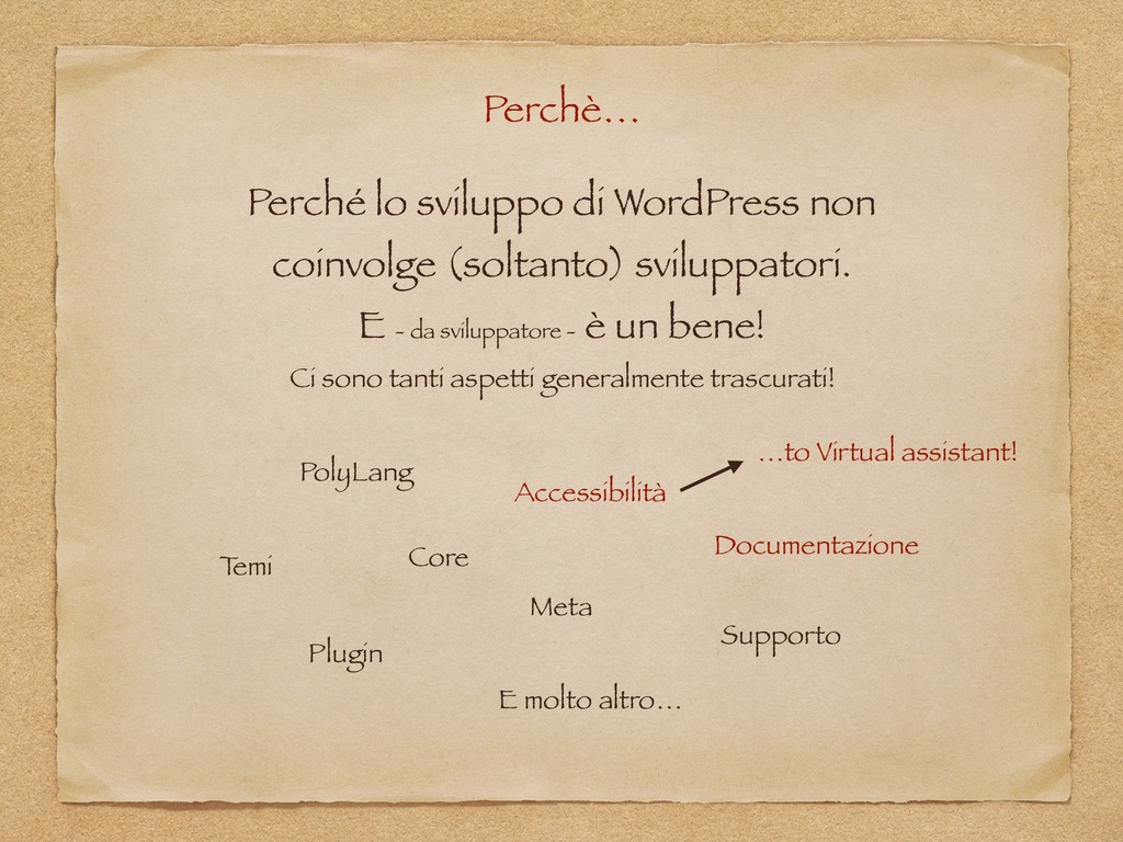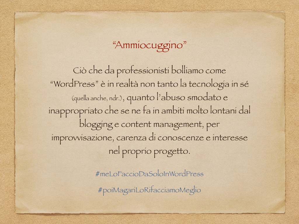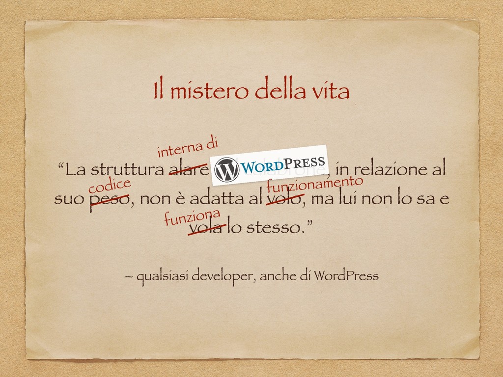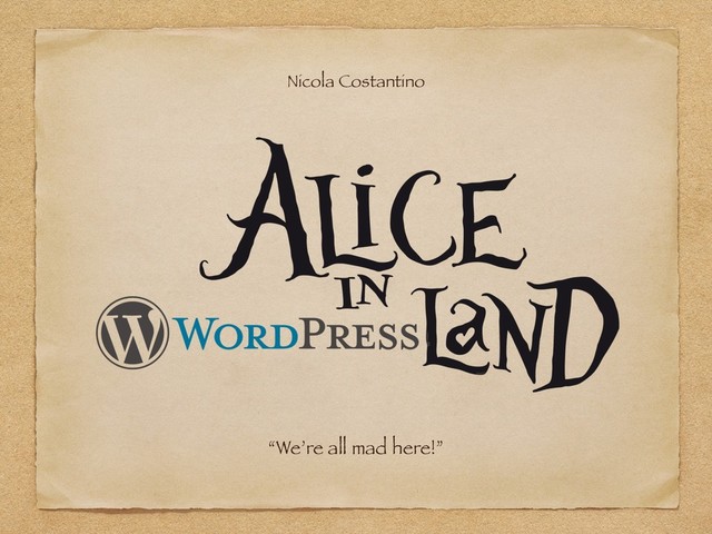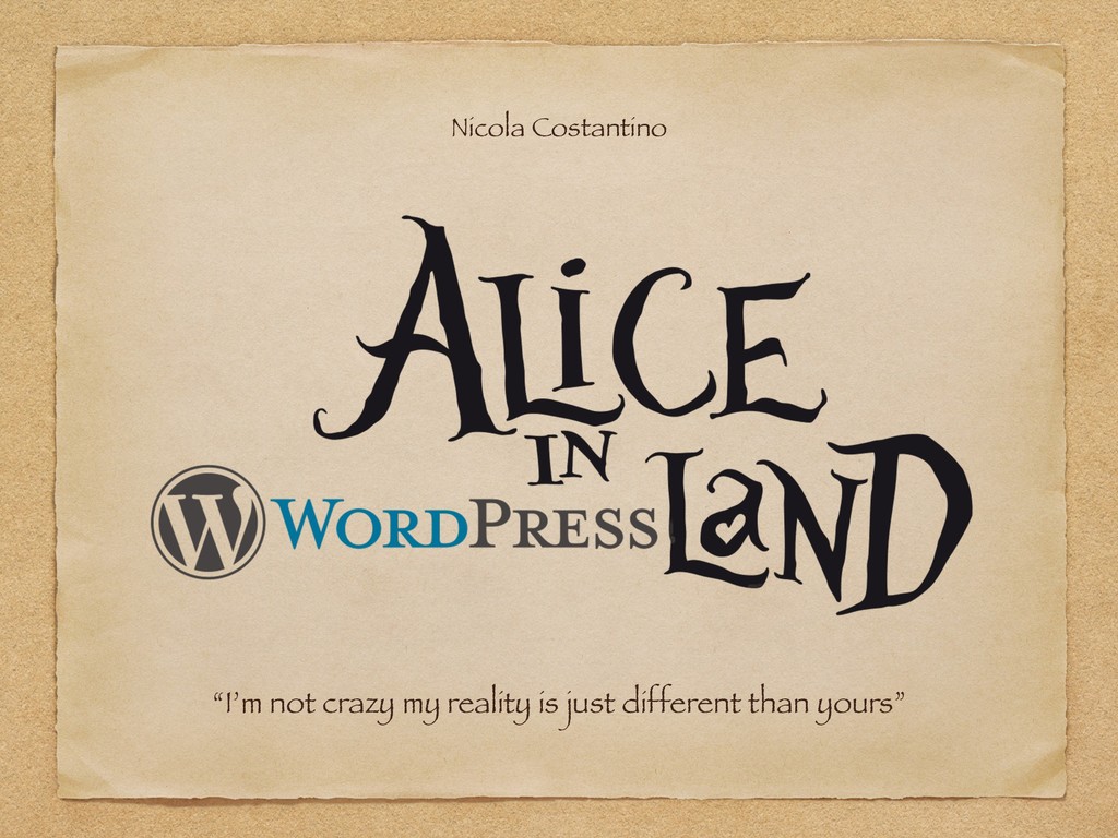 "Alice in WordPressLand" è un talk ironico ed esperienziale nato dalle riflessioni post-WordCamp dal punto di vista di uno sviluppatore giornalmente alle prese con Web Framework, tecnologie e "linguaggi serissimi". La presentazione include una serie di analisi e valutazioni soggettive sui veri punti di forza di WordPress ed alcuni suoi aspetti (spesso poco tecnici) talvolta trascurati, ma determinanti per la sua adozione. Si passa, infine, per una serie di best practices - scoperte, autoimposte e affermatesi nel corso degli anni - che portano anche a ricongiugersi ai valori dell'Agile ed riscoprirne i principi per una concezione più profonda ed innovativa del ruolo di sviluppatore.