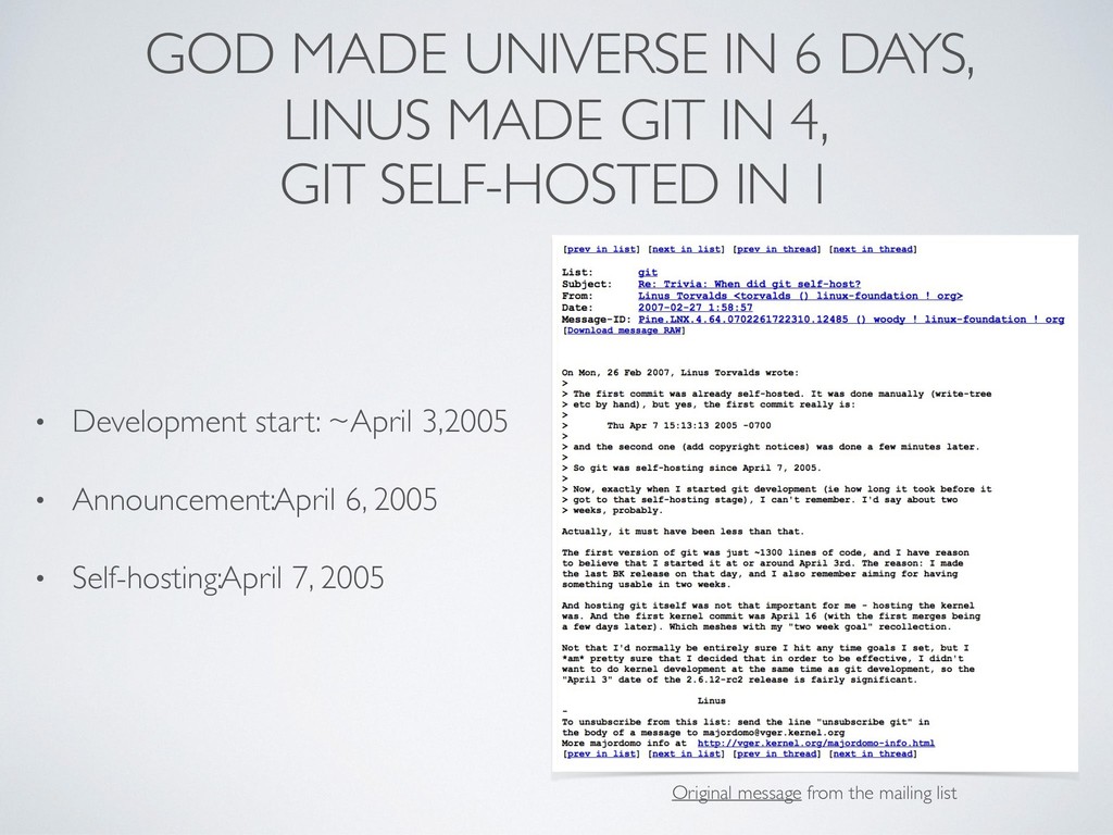 4, GIT SELF-HOSTED IN 1 • Development start: ~April 3, 2005 • Announcement: April 6, 2005 • Self-hosting: April 7, 2005 Original message from the mailing list
