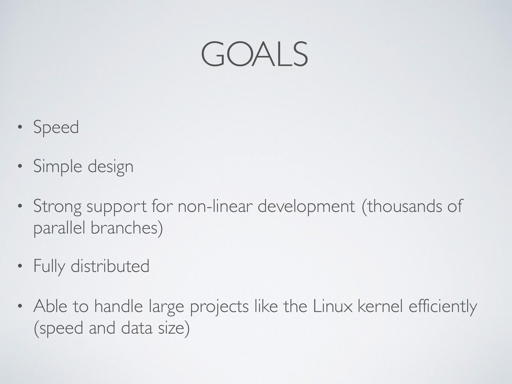 non-linear development (thousands of parallel branches) • Fully distributed • Able to handle large projects like the Linux kernel efficiently (speed and data size)