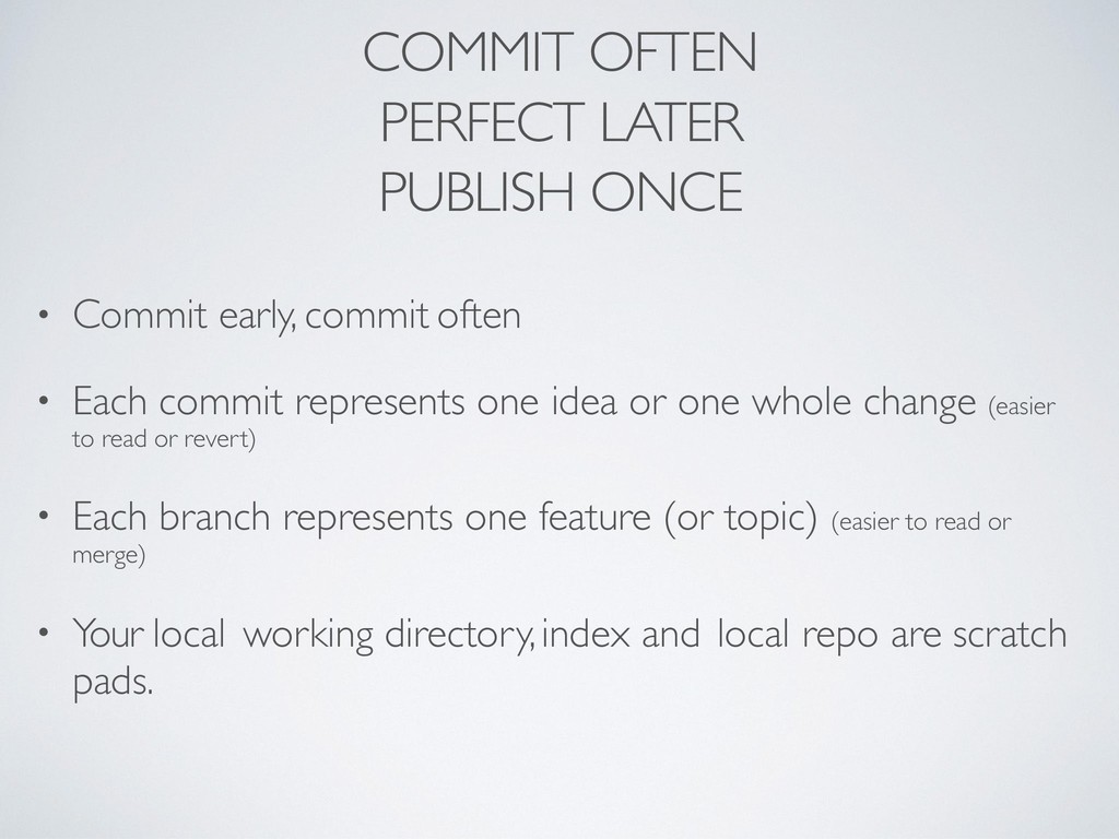 often • Each commit represents one idea or one whole change (easier to read or revert) • Each branch represents one feature (or topic) (easier to read or merge) • Your local working directory, index and local repo are scratch pads.