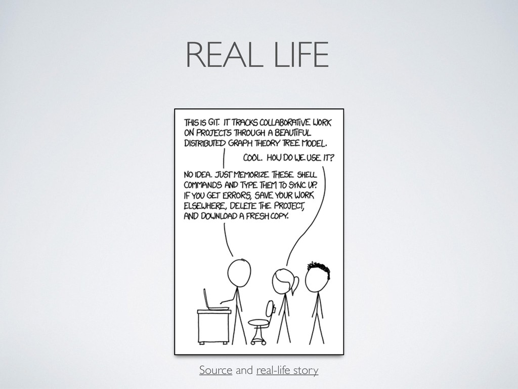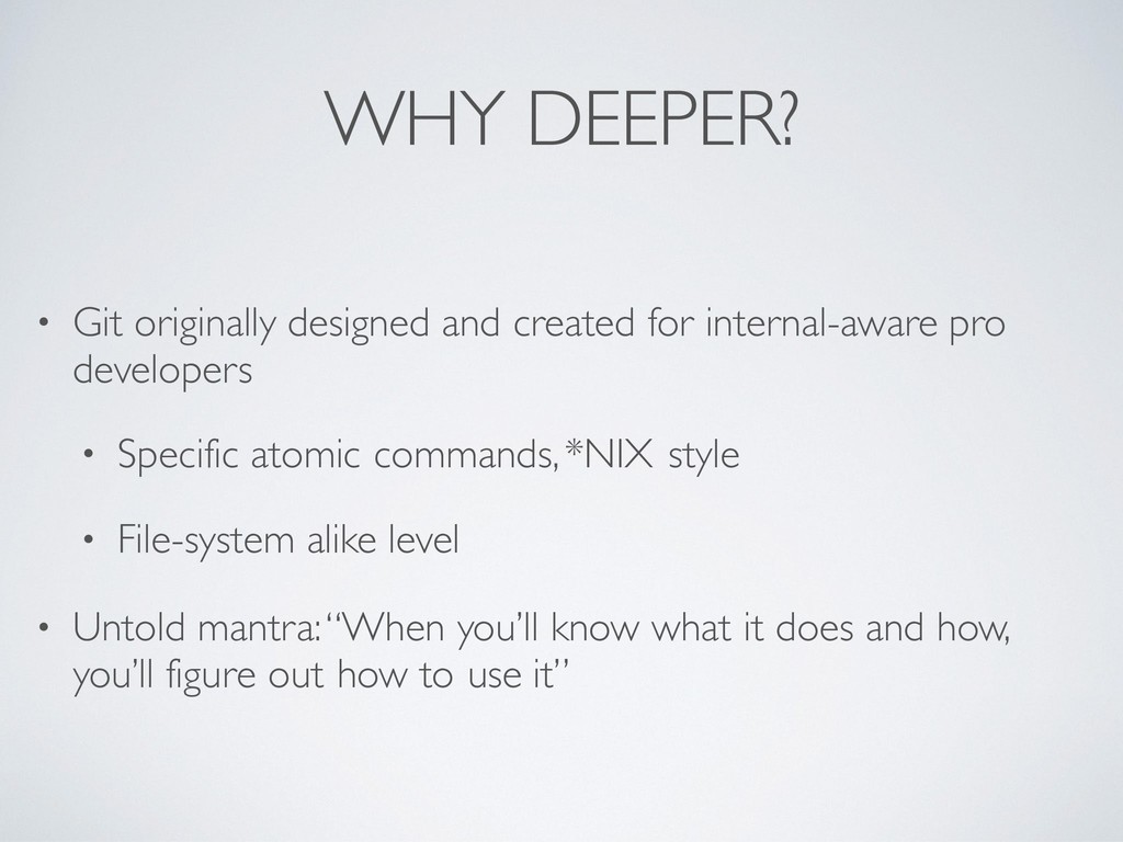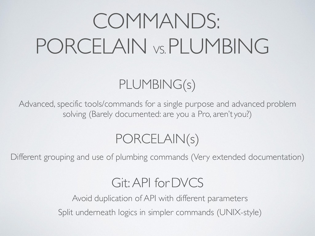 single purpose and advanced problem solving (Barely documented: are you a Pro, aren’t you?) PORCELAIN(s) Different grouping and use of plumbing commands (Very extended documentation) Git: API for DVCS Avoid duplication of API with different parameters Split underneath logics in simpler commands (UNIX-style)