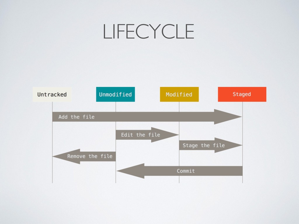 • Working directory/area: brothers (and descendents) of .git folder • Stage/Staging area/Cache/Index: (synonyms, index originally) index of changes to commit • Stashing area/Stash: clipboard-ish area where to temporarily save the changes not to be committed, facility external to VCS