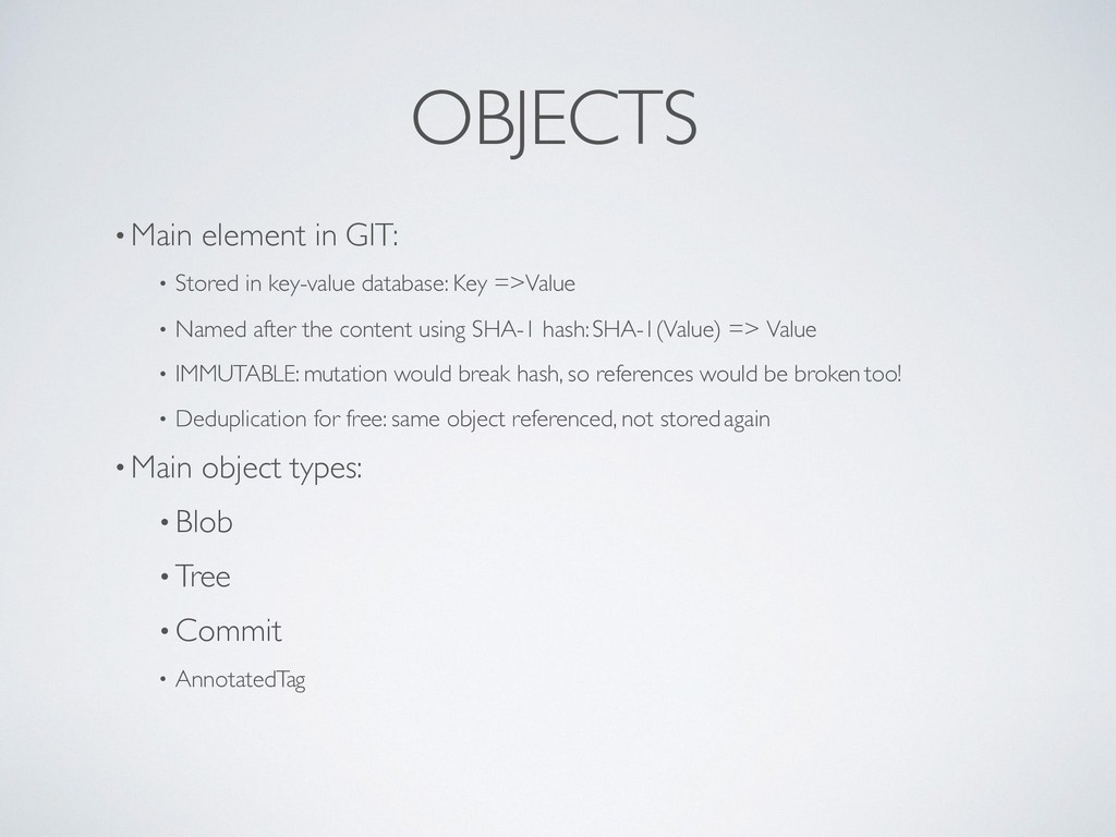 database: Key => Value • Named after the content using SHA-1 hash: SHA-1(Value) => Value • IMMUTABLE: mutation would break hash, so references would be broken too! • Deduplication for free: same object referenced, not stored again • Main object types: • Blob • Tree • Commit • Annotated Tag