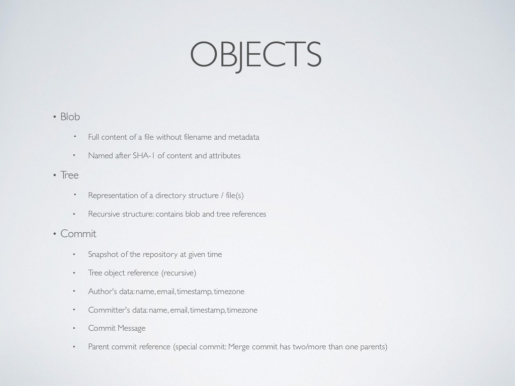 filename and metadata • Named after SHA-1 of content and attributes • T ree • Representation of a directory structure / file(s) • Recursive structure: contains blob and tree references • Commit • Snapshot of the repository at given time • Tree object reference (recursive) • Author's data: name, email, timestamp, timezone • Committer's data: name, email, timestamp, timezone • Commit Message • Parent commit reference (special commit: Merge commit has two/more than one parents)