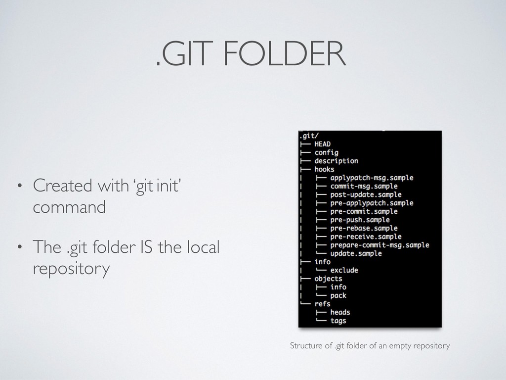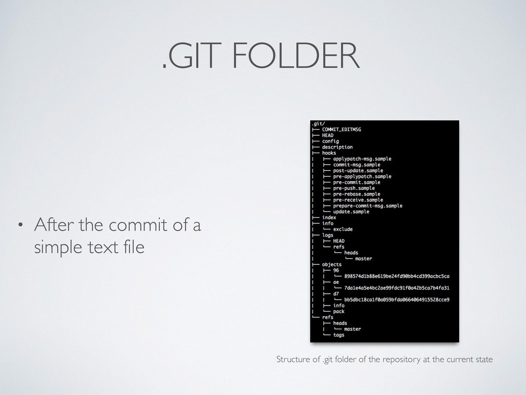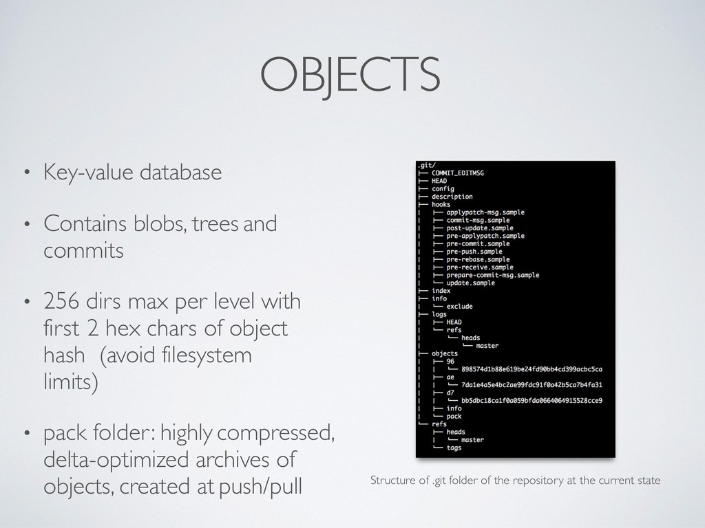 • 256 dirs max per level with first 2 hex chars of object hash (avoid filesystem limits) • pack folder: highly compressed, delta-optimized archives of objects, created at push/pull Structure of .git folder of the repository at the current state