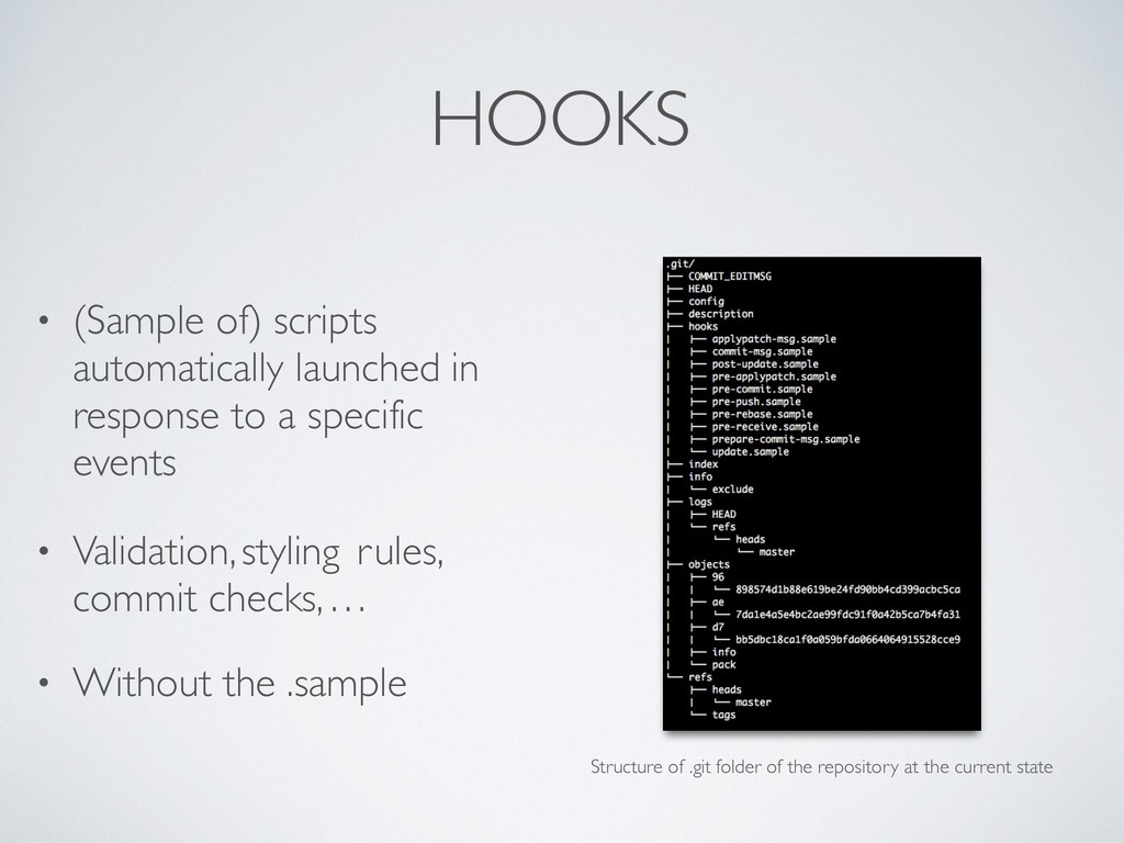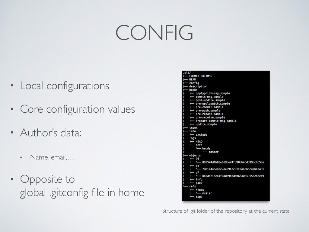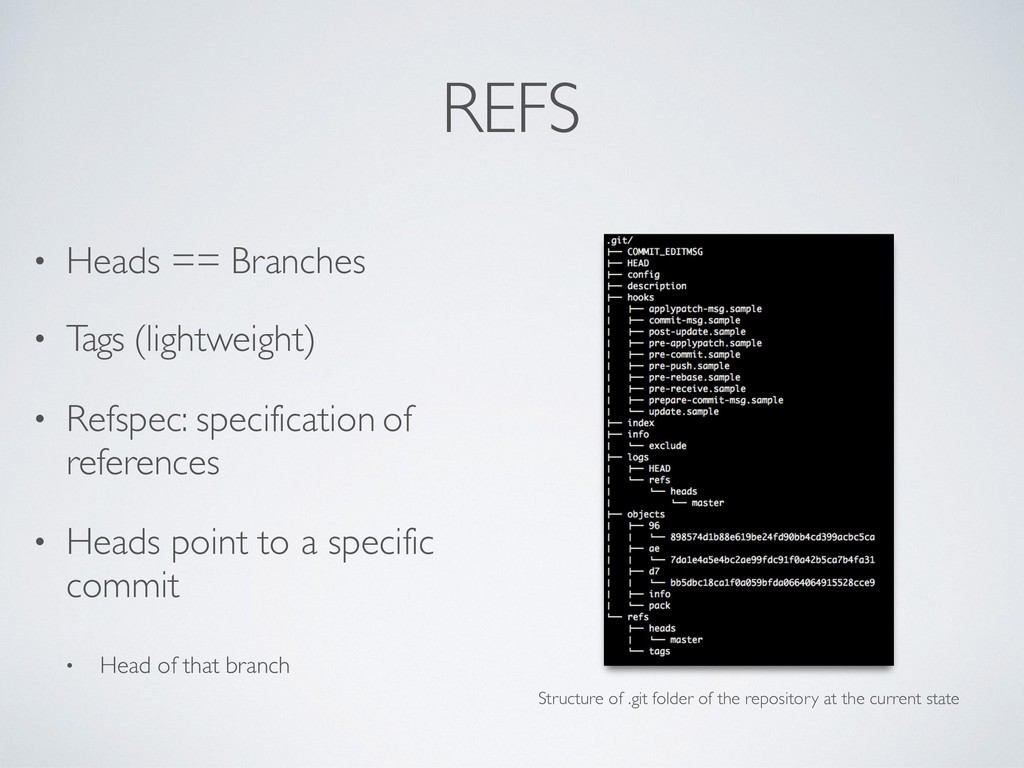 working area • Relative pointing to a refs, e.g.: • ‘ref: refs/heads/master’ • In detached state if it points to an hash • only good for read-only navigation of the repo, destructive otherwise Structure of .git folder of the repository at the current state