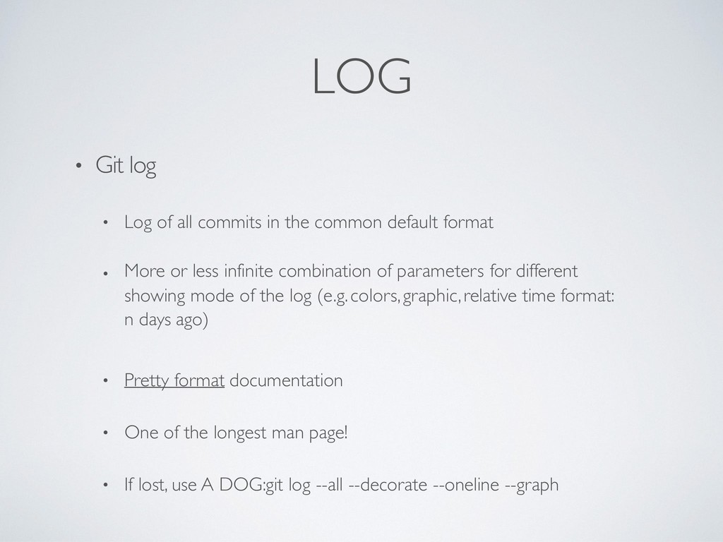 the common default format • More or less infinite combination of parameters for different showing mode of the log (e.g. colors, graphic, relative time format: n days ago) • Pretty format documentation • One of the longest man page! • If lost, use A DOG: git log --all --decorate --oneline --graph