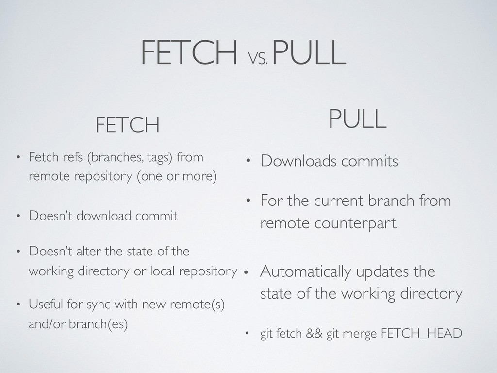remote repository (one or more) • Doesn’t download commit • Useful for sync with new remote(s) and/or branch(es) PULL • Downloads commits • For the current branch from remote counterpart • Doesn’t alter the state of the working directory or local repository • Automatically updates the state of the working directory • git fetch && git merge FETCH_HEAD