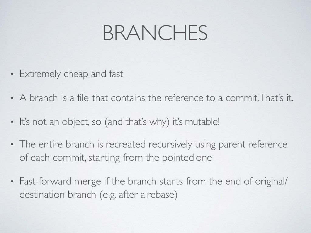a file that contains the reference to a commit.That’s it. • It’s not an object, so (and that’s why) it’s mutable! • The entire branch is recreated recursively using parent reference of each commit, starting from the pointed one • Fast-forward merge if the branch starts from the end of original/ destination branch (e.g. after a rebase)