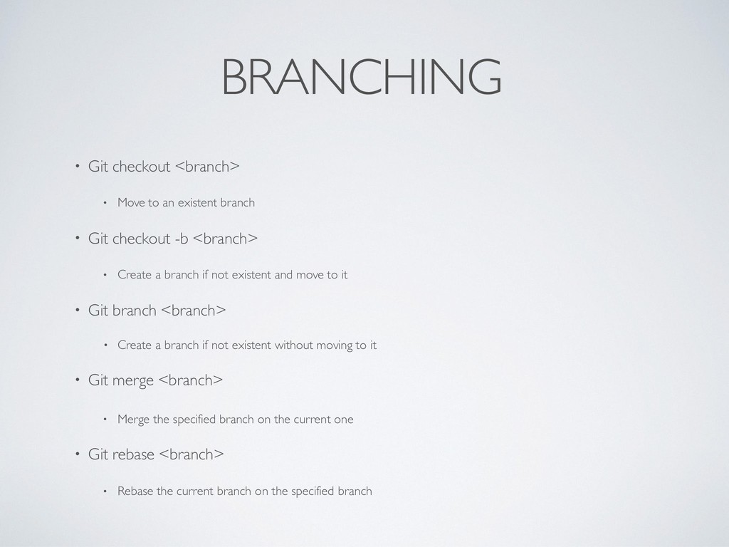 branch • Git checkout -b <branch> • Create a branch if not existent and move to it • Git branch <branch> • Create a branch if not existent without moving to it • Git merge <branch> • Merge the specified branch on the current one • Git rebase <branch> • Rebase the current branch on the specified branch
