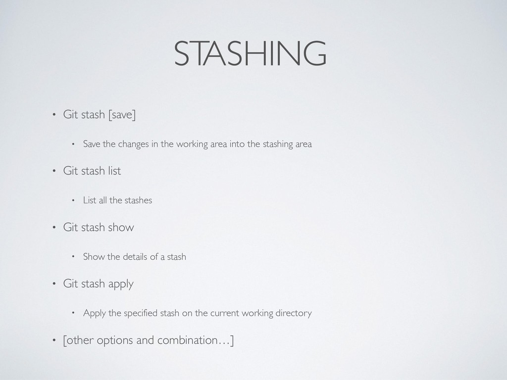 in the working area into the stashing area • Git stash list • List all the stashes • Git stash show • Show the details of a stash • Git stash apply • Apply the specified stash on the current working directory • [other options and combination…]