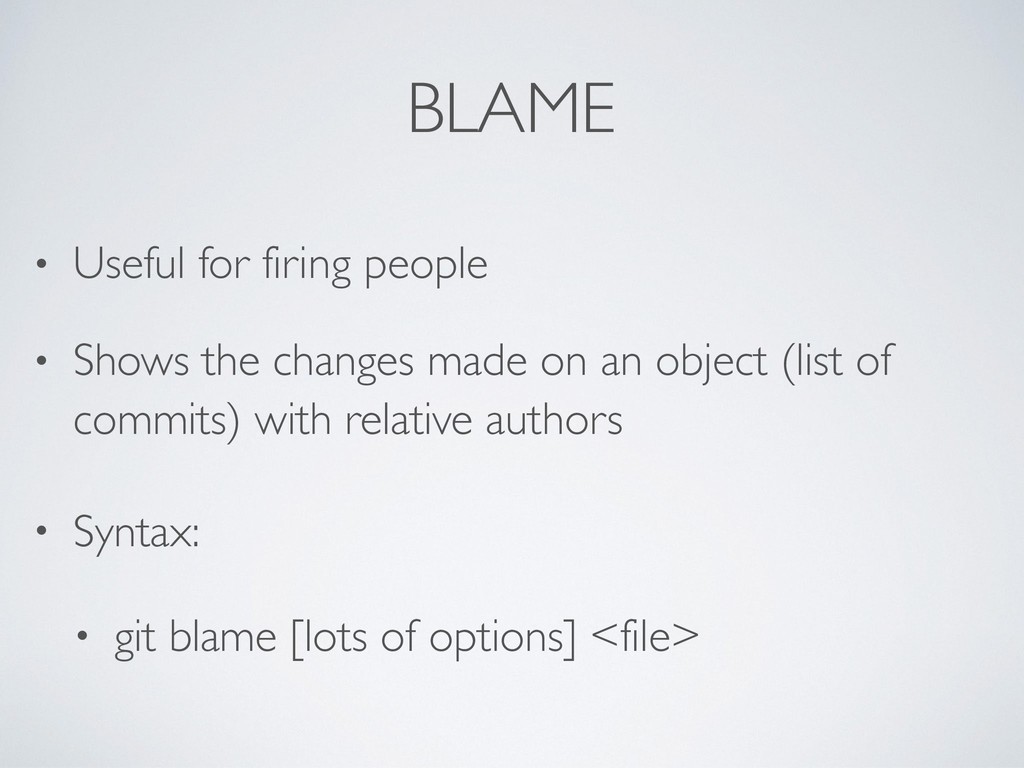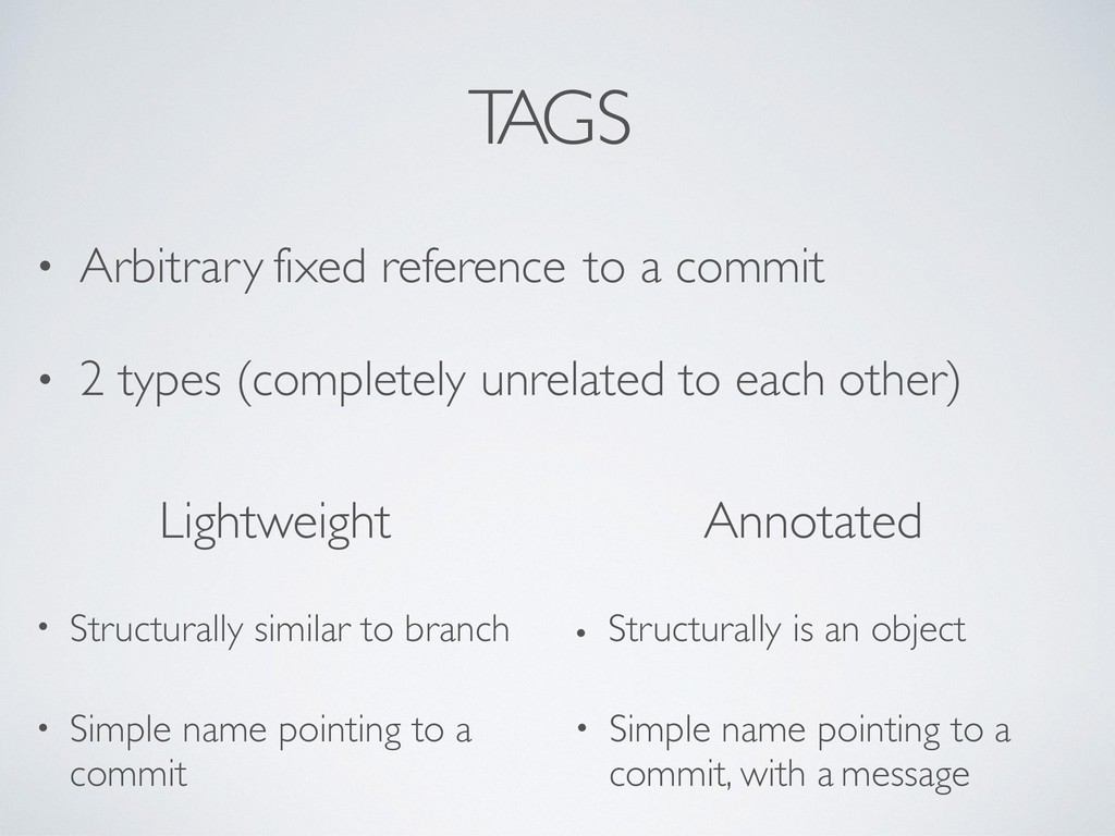 Arbitrary fixed reference to a commit • 2 types (completely unrelated to each other) Lightweight Annotated • Structurally similar to branch • Structurally is an object • Simple name pointing to a commit, with a message