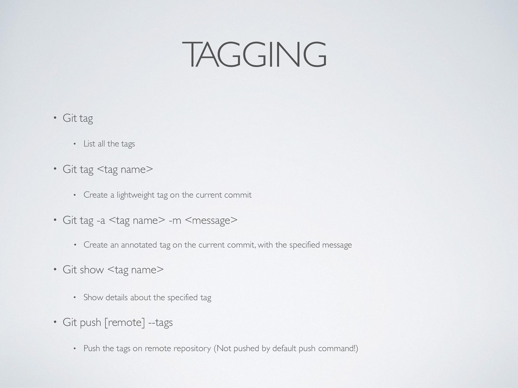 • Git tag <tag name> • Create a lightweight tag on the current commit • Git tag -a <tag name> -m <message> • Create an annotated tag on the current commit, with the specified message • Git show <tag name> • Show details about the specified tag • Git push [remote] --tags • Push the tags on remote repository (Not pushed by default push command!)