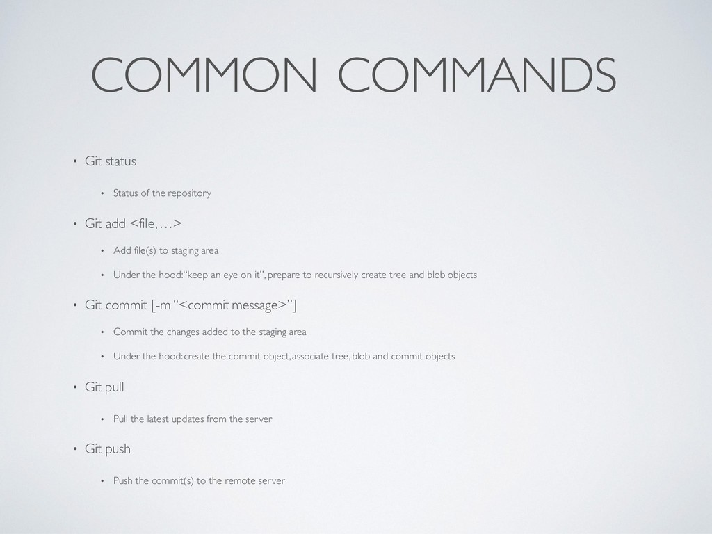 • Git add <file, …> • Add file(s) to staging area • Under the hood:“keep an eye on it”, prepare to recursively create tree and blob objects • Git commit [-m “<commit message>”] • Commit the changes added to the staging area • Under the hood: create the commit object, associate tree, blob and commit objects • Git pull • Pull the latest updates from the server • Git push • Push the commit(s) to the remote server