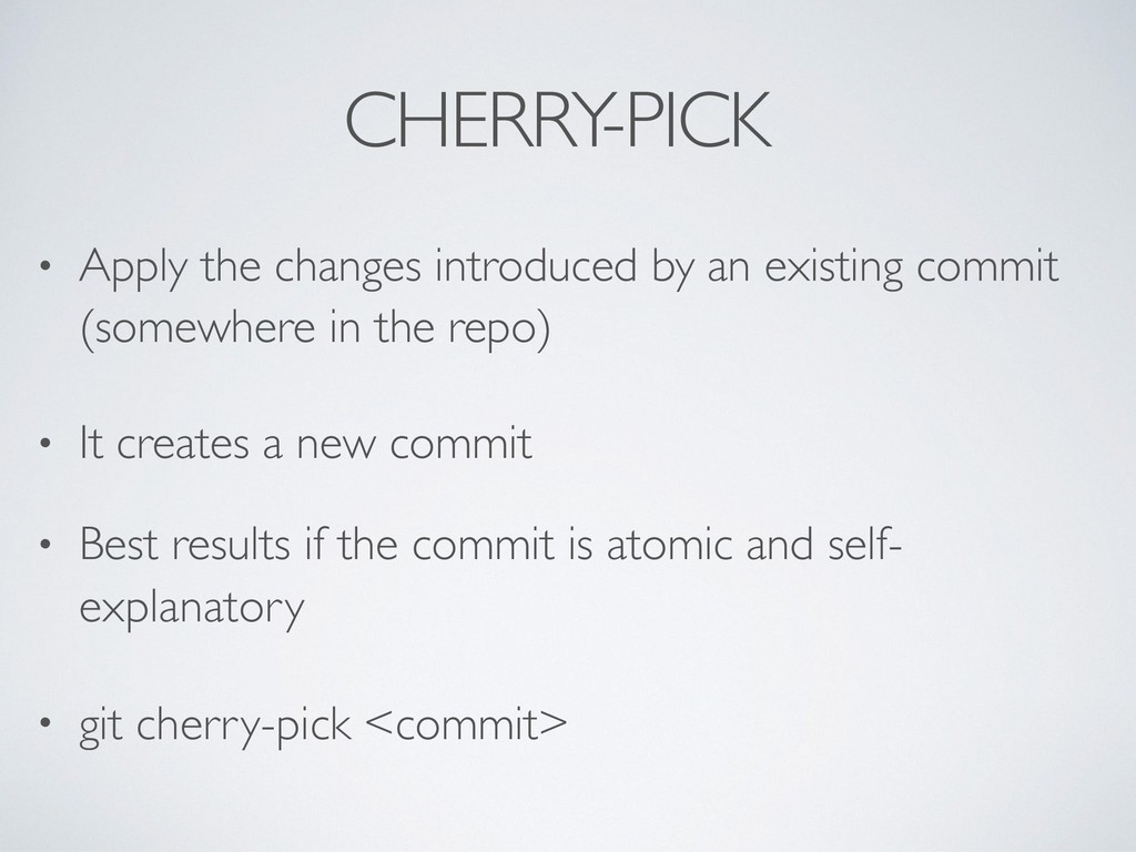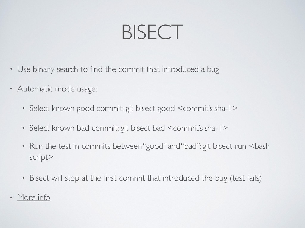 introduced a bug • Automatic mode usage: • Select known good commit: git bisect good <commit’s sha-1> • Select known bad commit: git bisect bad <commit’s sha-1> • Run the test in commits between “good” and “bad”: git bisect run <bash script> • Bisect will stop at the first commit that introduced the bug (test fails) • More info