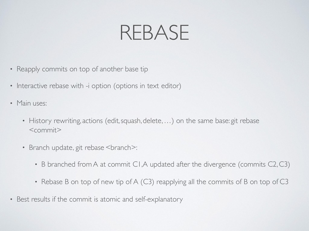• Interactive rebase with -i option (options in text editor) • Main uses: • History rewriting, actions (edit, squash, delete, …) on the same base: git rebase <commit> • Branch update, git rebase <branch>: • B branched from A at commit C1, A updated after the divergence (commits C2, C3) • Rebase B on top of new tip of A (C3) reapplying all the commits of B on top of C3 • Best results if the commit is atomic and self-explanatory