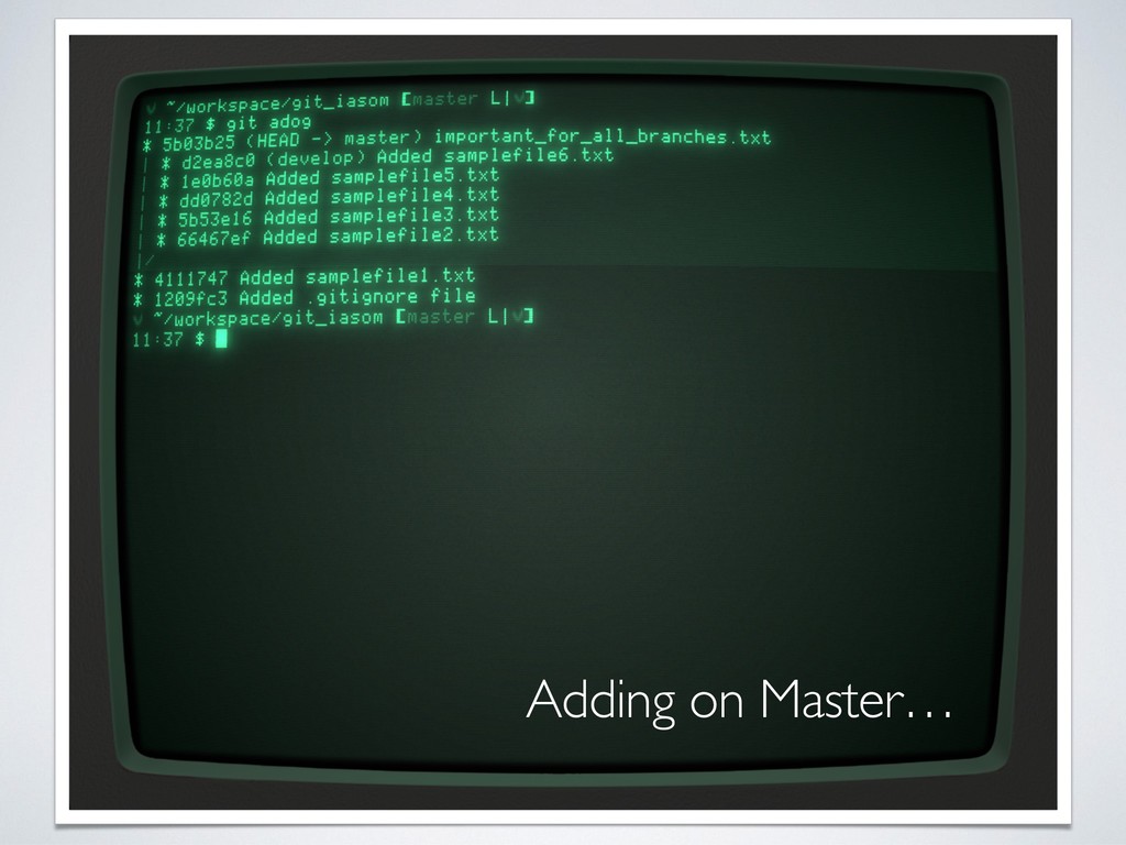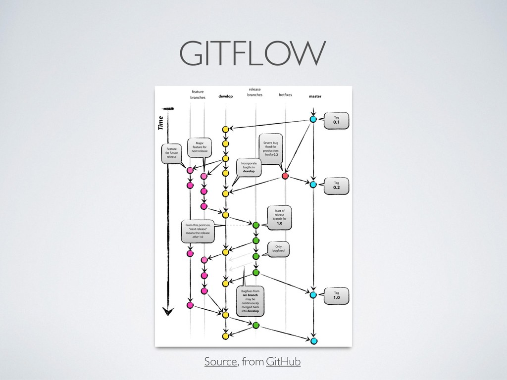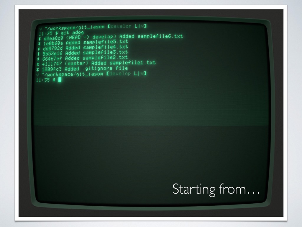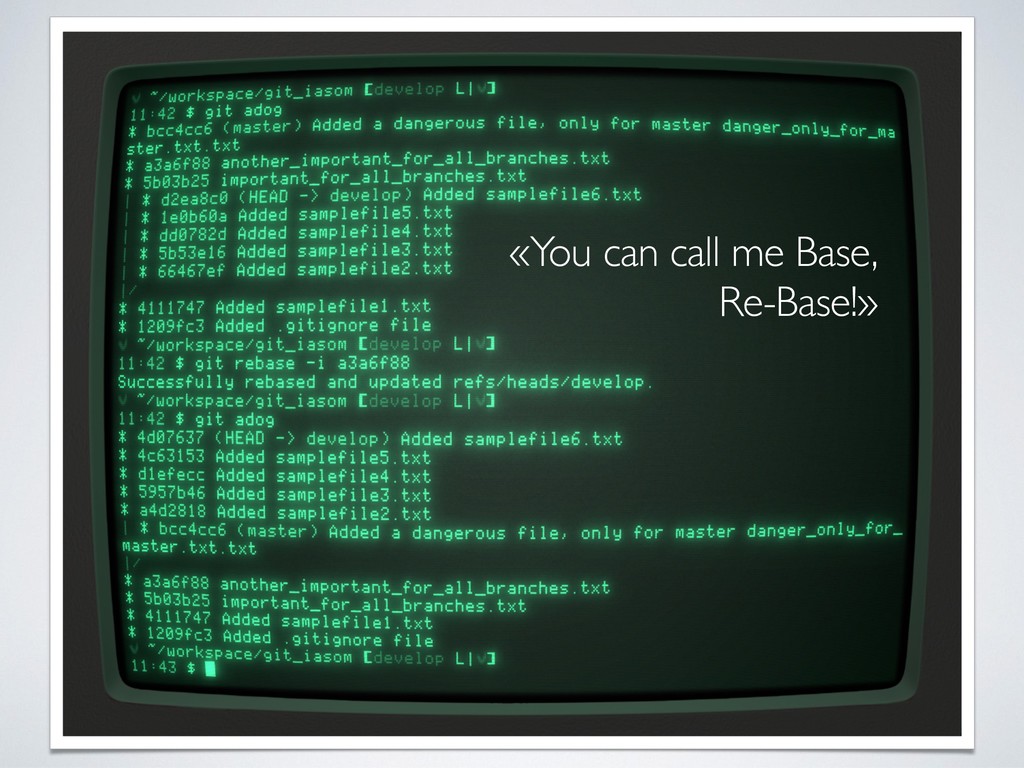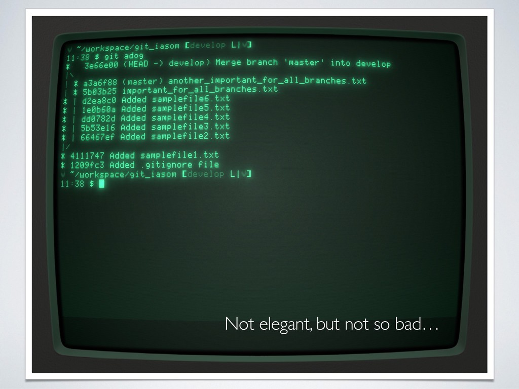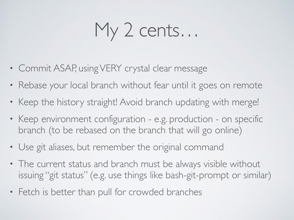 message • Rebase your local branch without fear until it goes on remote • Keep the history straight! Avoid branch updating with merge! • Keep environment configuration - e.g. production - on specific branch (to be rebased on the branch that will go online) • Use git aliases, but remember the original command • The current status and branch must be always visible without issuing “git status” (e.g. use things like bash-git-prompt or similar) • Fetch is better than pull for crowded branches