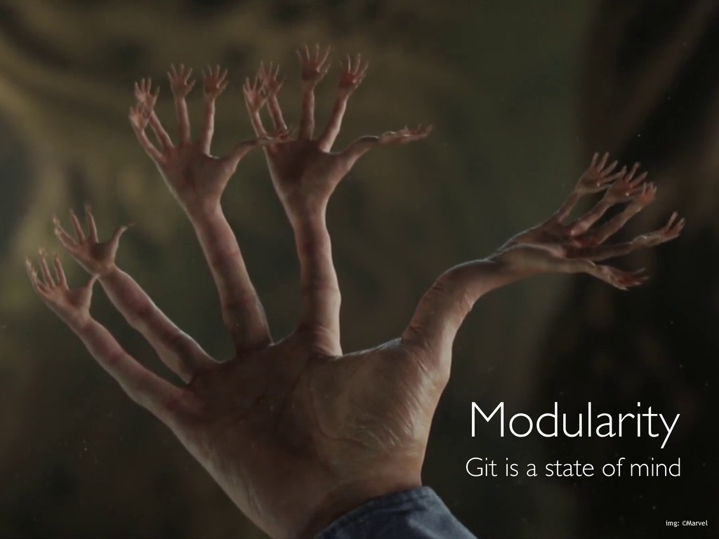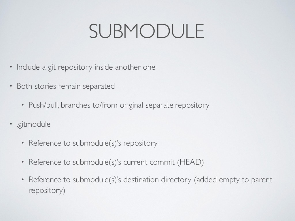 Both stories remain separated • Push/pull, branches to/from original separate repository • .gitmodule • Reference to submodule(s)’s repository • Reference to submodule(s)’s current commit (HEAD) • Reference to submodule(s)’s destination directory (added empty to parent repository)
