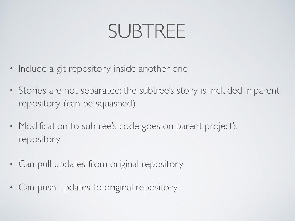 Stories are not separated: the subtree’s story is included in parent repository (can be squashed) • Modification to subtree’s code goes on parent project’s repository • Can pull updates from original repository • Can push updates to original repository