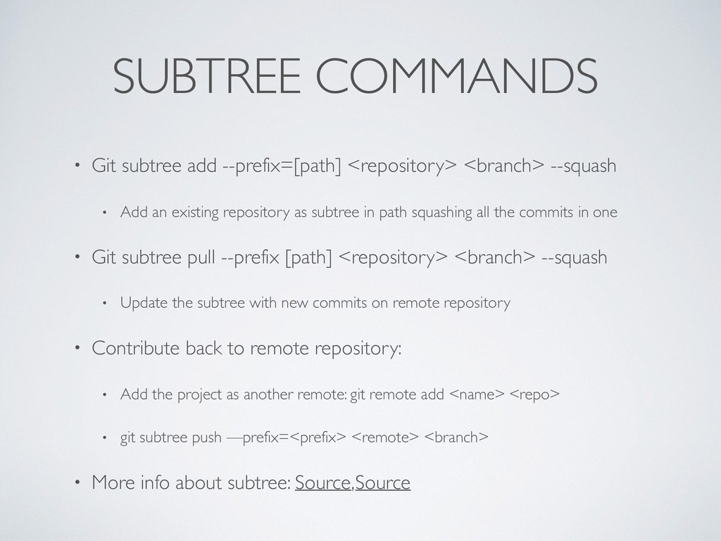 • Add an existing repository as subtree in path squashing all the commits in one • Git subtree pull --prefix [path] <repository> <branch> --squash • Update the subtree with new commits on remote repository • Contribute back to remote repository: • Add the project as another remote: git remote add <name> <repo> • git subtree push —prefix=<prefix> <remote> <branch> • More info about subtree: Source, Source