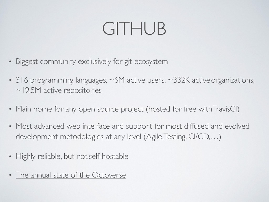 programming languages, ~6M active users, ~332K active organizations, ~19.5M active repositories • Main home for any open source project (hosted for free with TravisCI) • Most advanced web interface and support for most diffused and evolved development metodologies at any level (Agile,Testing, CI/CD, …) • Highly reliable, but not self-hostable • The annual state of the Octoverse