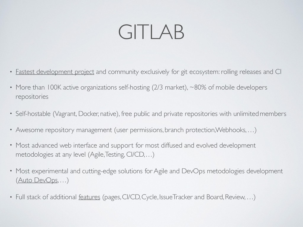 ecosystem: rolling releases and CI • More than 100K active organizations self-hosting (2/3 market), ~80% of mobile developers repositories • Self-hostable (Vagrant, Docker, native), free public and private repositories with unlimited members • Awesome repository management (user permissions, branch protection, Webhooks, …) • Most advanced web interface and support for most diffused and evolved development metodologies at any level (Agile,Testing, CI/CD, …) • Most experimental and cutting-edge solutions for Agile and DevOps metodologies development (Auto DevOps, …) • Full stack of additional features (pages, CI/CD, Cycle, Issue Tracker and Board, Review, …)