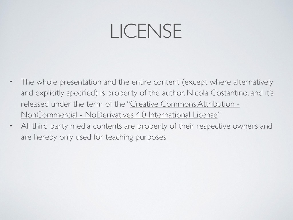 where alternatively and explicitly specified) is property of the author, Nicola Costantino, and it’s released under the term of the “Creative Commons Attribution - NonCommercial - NoDerivatives 4.0 International License” • All third party media contents are property of their respective owners and are hereby only used for teaching purposes