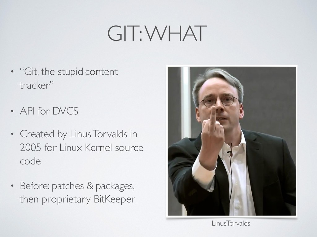 English slang): “I’m an egotistical bastard, and I name all my projects after myself. First ‘Linux’, now ‘git’.” (source) From the original README (source)