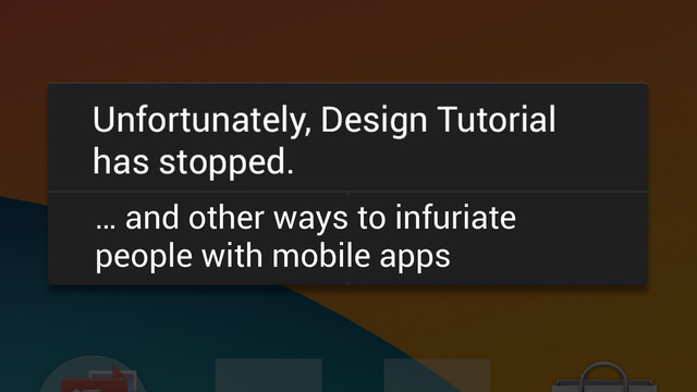 "'Unfortunately, Design Tutorial Has Stopped', and Other Ways to Infuriate People With Mobile Apps (OSCON 2014)" was a 3 hour tutorial by Secret Lab (http://www.secretlab.com.au) and Chris Neugebauer (http://chris.neugebauer.id.au) for OSCON 2014 (http://www.oscon.com)