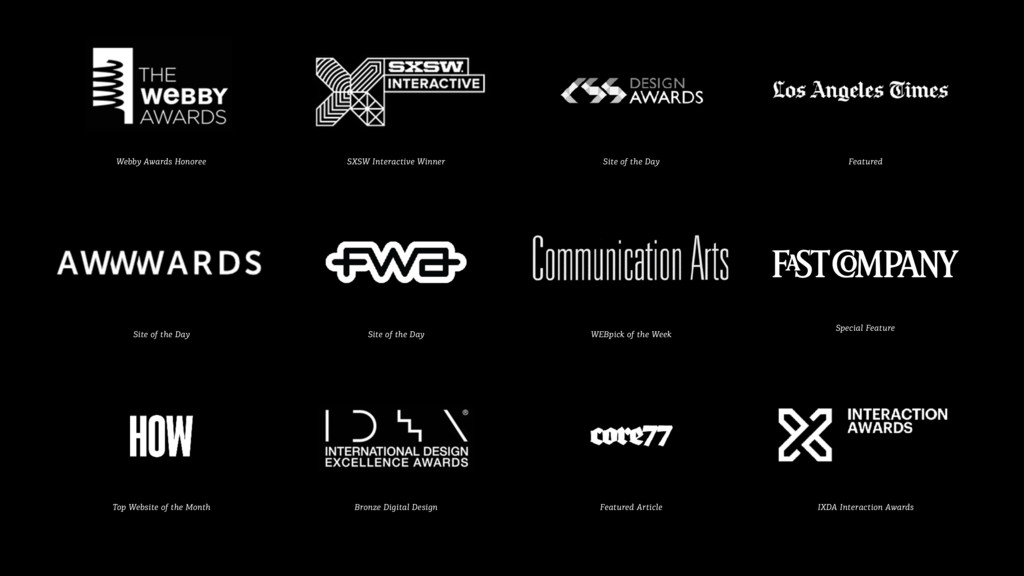the Week Special Feature Top Website of the Month Bronze Digital Design Featured Article IXDA Interaction Awards Site of the Day Featured Webby Awards Honoree SXSW Interactive Winner