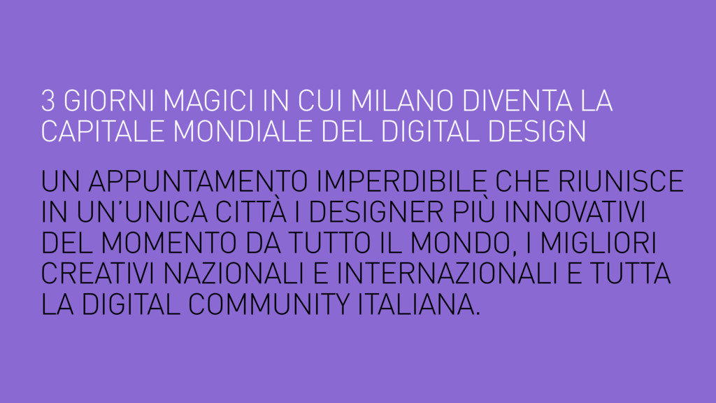 PIÙ INNOVATIVI DEL MOMENTO DA TUTTO IL MONDO, I MIGLIORI CREATIVI NAZIONALI E INTERNAZIONALI E TUTTA LA DIGITAL COMMUNITY ITALIANA. 3 GIORNI MAGICI IN CUI MILANO DIVENTA LA CAPITALE MONDIALE DEL DIGITAL DESIGN