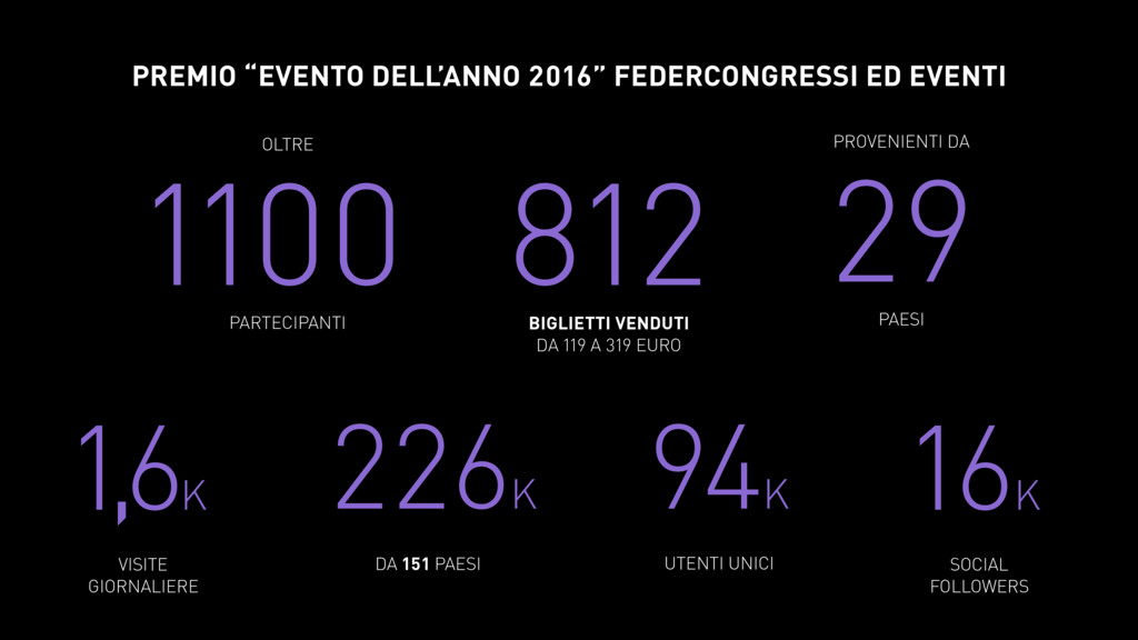 16K SOCIAL FOLLOWERS 1100 PARTECIPANTI OLTRE 812 BIGLIETTI VENDUTI DA 119 A 319 EURO 29 PAESI PROVENIENTI DA PREMIO “EVENTO DELL’ANNO 2016” FEDERCONGRESSI ED EVENTI
