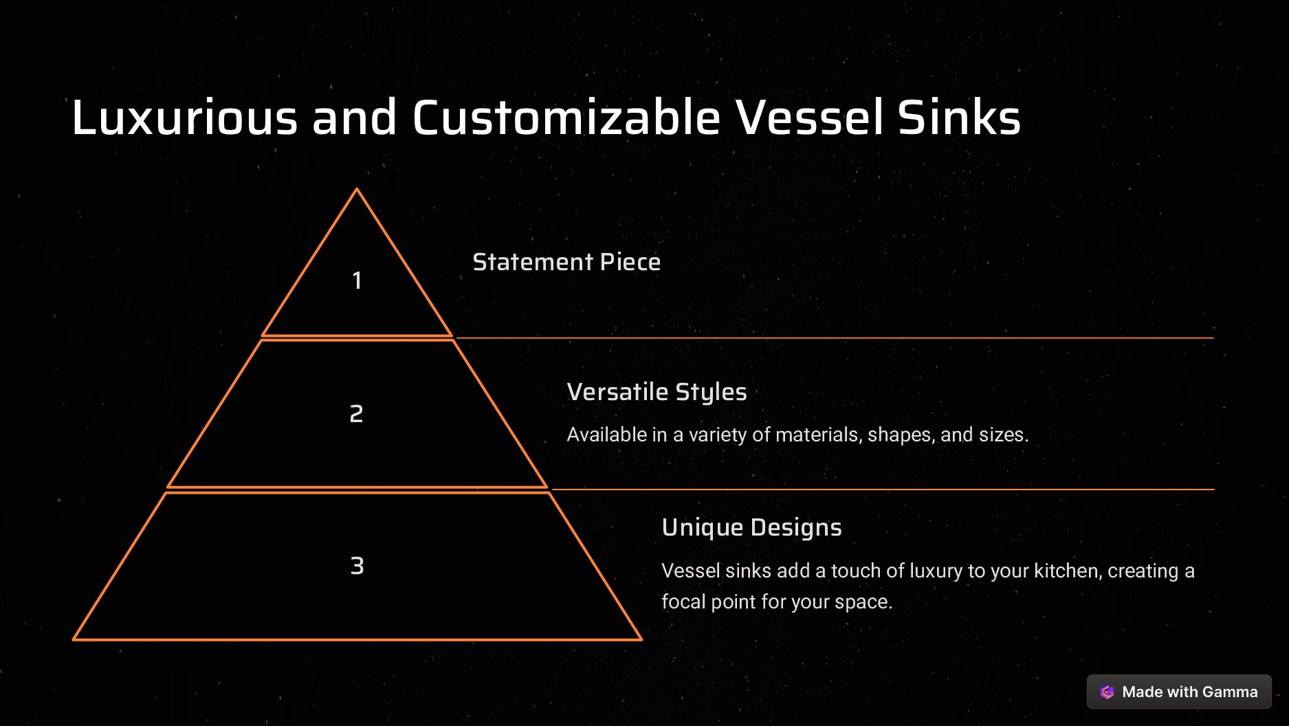 Styles Available in a variety of materials, shapes, and sizes. 3 Unique Designs Vessel sinks add a touch of luxury to your kitchen, creating a focal point for your space.