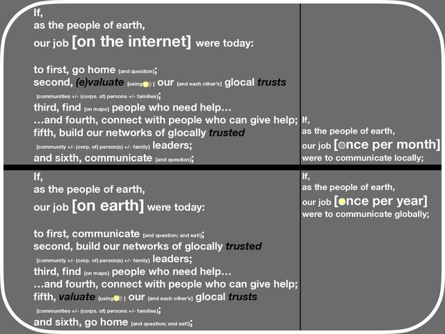 were today: to first, communicate [and question; and eat!] ; second, build our networks of glocally trusted [community +/- (corp. of) person(s) +/- family] leaders; third, find [on maps] people who need help… …and fourth, connect with people who can give help; fifth, valuate [using ] our [and each other’s] glocal trusts [communities +/- (corps. of) persons +/- families] ; and sixth, go home [and question; and eat!] ; If, as the people of earth, our job [on the internet] were today: to first, go home [and question] ; second, (e)valuate [using ] our [and each other’s] glocal trusts [communities +/- (corps. of) persons +/- families] ; third, find [on maps] people who need help… …and fourth, connect with people who can give help; fifth, build our networks of glocally trusted [community +/- (corp. of) person(s) +/- family] leaders; and sixth, communicate [and question] ; If, as the people of earth, our job [once per month] were to communicate locally; If, as the people of earth, our job [once per year] were to communicate globally;