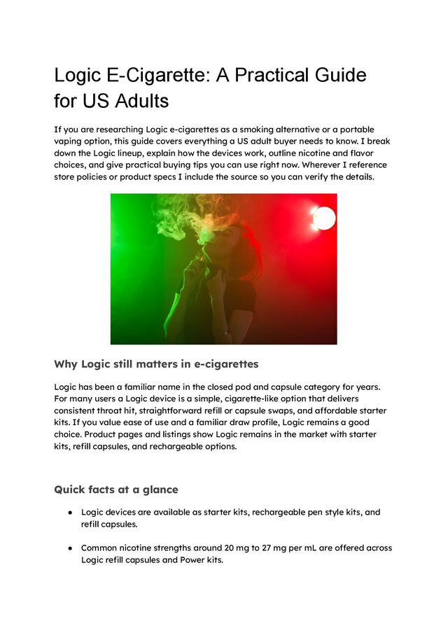 are researching Logic e-cigarettes as a smoking alternative or a portable vaping option, this guide covers everything a US adult buyer needs to know. I break down the Logic lineup, explain how the devices work, outline nicotine and flavor choices, and give practical buying tips you can use right now. Wherever I reference store policies or product specs I include the source so you can verify the details. Why Logic still matters in e-cigarettes Logic has been a familiar name in the closed pod and capsule category for years. For many users a Logic device is a simple, cigarette-like option that delivers consistent throat hit, straightforward refill or capsule swaps, and affordable starter kits. If you value ease of use and a familiar draw profile, Logic remains a good choice. Product pages and listings show Logic remains in the market with starter kits, refill capsules, and rechargeable options. Quick facts at a glance • Logic devices are available as starter kits, rechargeable pen style kits, and refill capsules. • Common nicotine strengths around 20 mg to 27 mg per mL are offered across Logic refill capsules and Power kits.