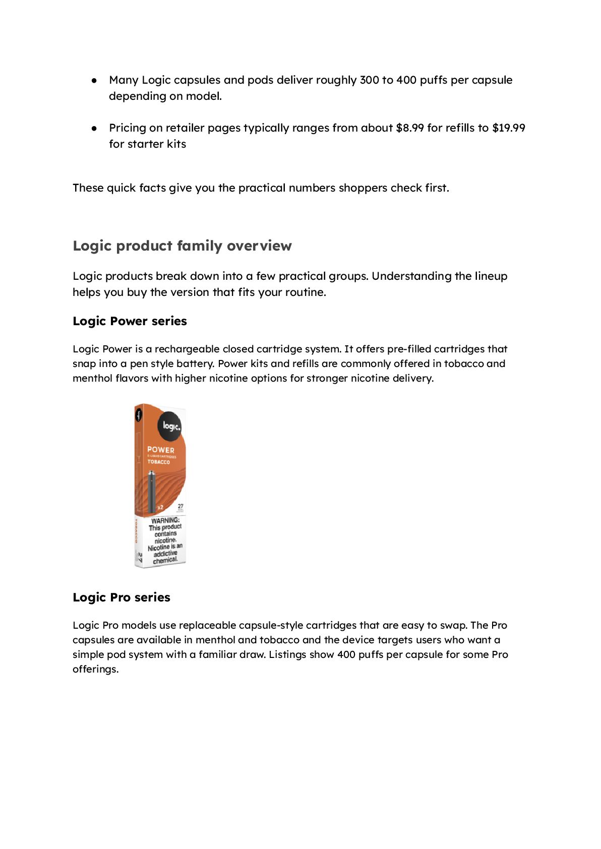 400 puffs per capsule depending on model. • Pricing on retailer pages typically ranges from about $8.99 for refills to $19.99 for starter kits These quick facts give you the practical numbers shoppers check first. Logic product family overview Logic products break down into a few practical groups. Understanding the lineup helps you buy the version that fits your routine. Logic Power series Logic Power is a rechargeable closed cartridge system. It offers pre-filled cartridges that snap into a pen style battery. Power kits and refills are commonly offered in tobacco and menthol flavors with higher nicotine options for stronger nicotine delivery. Logic Pro series Logic Pro models use replaceable capsule-style cartridges that are easy to swap. The Pro capsules are available in menthol and tobacco and the device targets users who want a simple pod system with a familiar draw. Listings show 400 puffs per capsule for some Pro offerings.