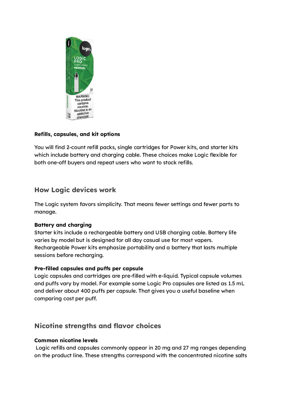 packs, single cartridges for Power kits, and starter kits which include battery and charging cable. These choices make Logic flexible for both one-off buyers and repeat users who want to stock refills. How Logic devices work The Logic system favors simplicity. That means fewer settings and fewer parts to manage. Battery and charging Starter kits include a rechargeable battery and USB charging cable. Battery life varies by model but is designed for all day casual use for most vapers. Rechargeable Power kits emphasize portability and a battery that lasts multiple sessions before recharging. Pre-filled capsules and puffs per capsule Logic capsules and cartridges are pre-filled with e-liquid. Typical capsule volumes and puffs vary by model. For example some Logic Pro capsules are listed as 1.5 mL and deliver about 400 puffs per capsule. That gives you a useful baseline when comparing cost per puff. Nicotine strengths and flavor choices Common nicotine levels Logic refills and capsules commonly appear in 20 mg and 27 mg ranges depending on the product line. These strengths correspond with the concentrated nicotine salts
