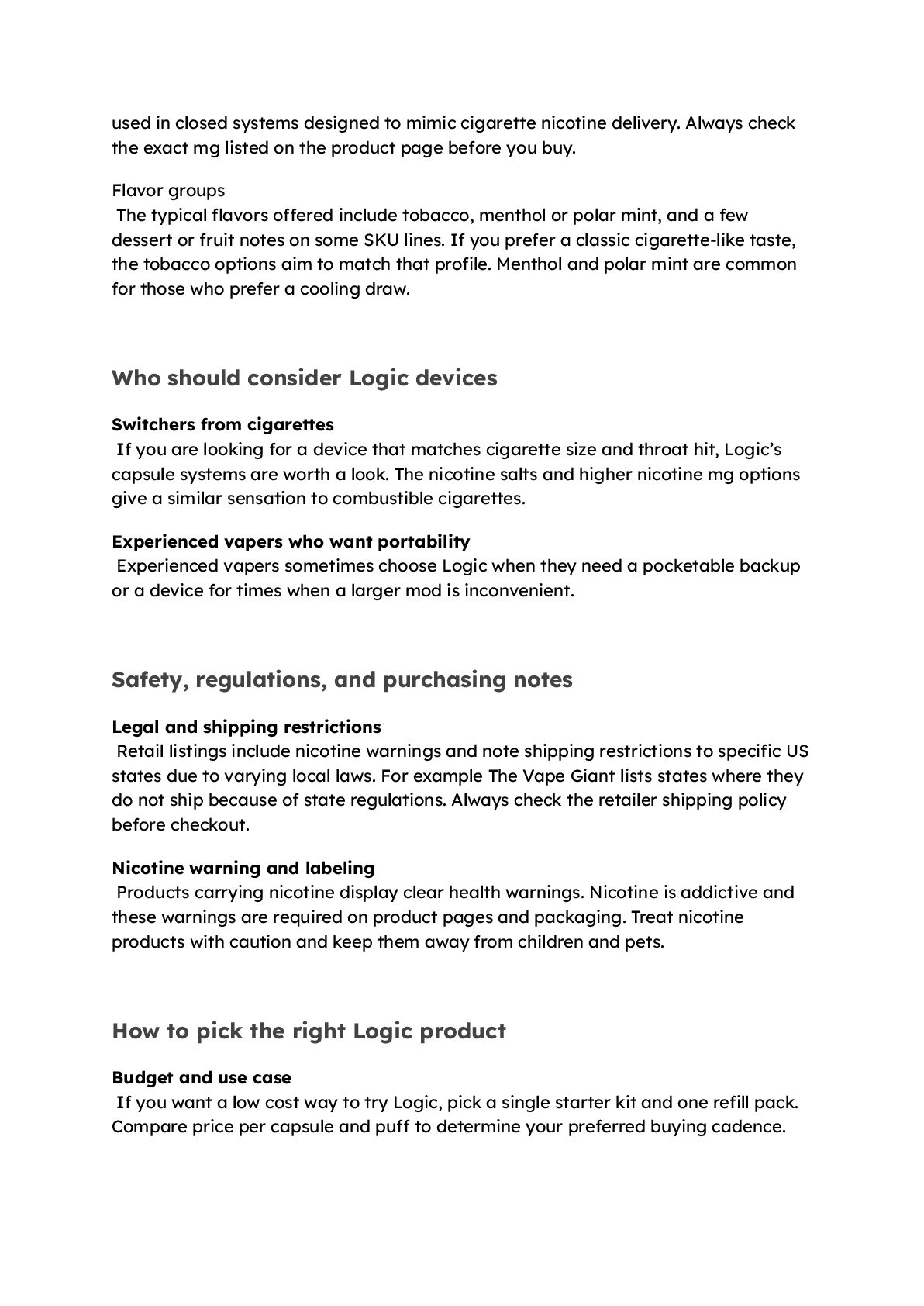 Always check the exact mg listed on the product page before you buy. Flavor groups The typical flavors offered include tobacco, menthol or polar mint, and a few dessert or fruit notes on some SKU lines. If you prefer a classic cigarette-like taste, the tobacco options aim to match that profile. Menthol and polar mint are common for those who prefer a cooling draw. Who should consider Logic devices Switchers from cigarettes If you are looking for a device that matches cigarette size and throat hit, Logic’s capsule systems are worth a look. The nicotine salts and higher nicotine mg options give a similar sensation to combustible cigarettes. Experienced vapers who want portability Experienced vapers sometimes choose Logic when they need a pocketable backup or a device for times when a larger mod is inconvenient. Safety, regulations, and purchasing notes Legal and shipping restrictions Retail listings include nicotine warnings and note shipping restrictions to specific US states due to varying local laws. For example The Vape Giant lists states where they do not ship because of state regulations. Always check the retailer shipping policy before checkout. Nicotine warning and labeling Products carrying nicotine display clear health warnings. Nicotine is addictive and these warnings are required on product pages and packaging. Treat nicotine products with caution and keep them away from children and pets. How to pick the right Logic product Budget and use case If you want a low cost way to try Logic, pick a single starter kit and one refill pack. Compare price per capsule and puff to determine your preferred buying cadence.