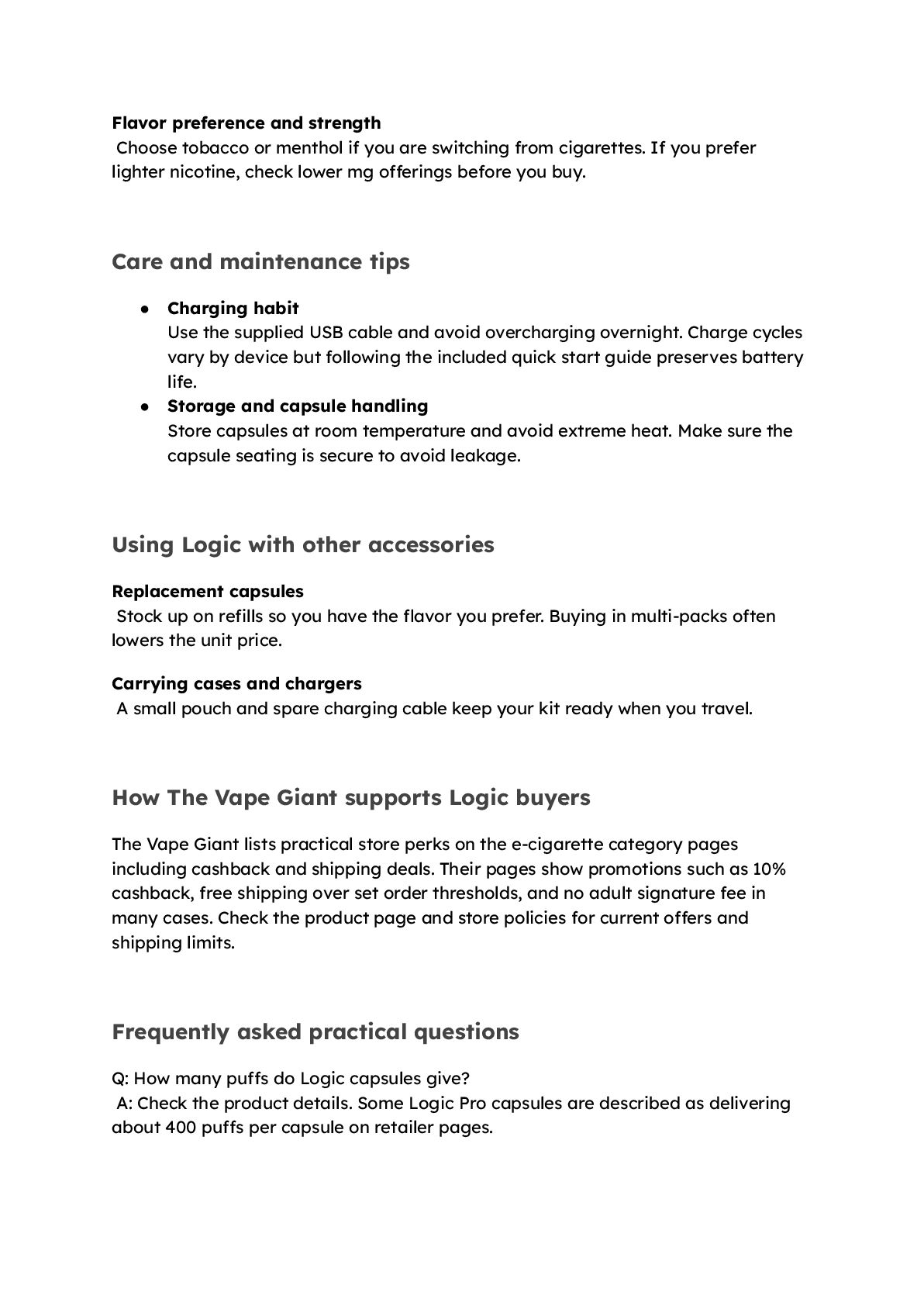 are switching from cigarettes. If you prefer lighter nicotine, check lower mg offerings before you buy. Care and maintenance tips • Charging habit Use the supplied USB cable and avoid overcharging overnight. Charge cycles vary by device but following the included quick start guide preserves battery life. • Storage and capsule handling Store capsules at room temperature and avoid extreme heat. Make sure the capsule seating is secure to avoid leakage. Using Logic with other accessories Replacement capsules Stock up on refills so you have the flavor you prefer. Buying in multi-packs often lowers the unit price. Carrying cases and chargers A small pouch and spare charging cable keep your kit ready when you travel. How The Vape Giant supports Logic buyers The Vape Giant lists practical store perks on the e-cigarette category pages including cashback and shipping deals. Their pages show promotions such as 10% cashback, free shipping over set order thresholds, and no adult signature fee in many cases. Check the product page and store policies for current offers and shipping limits. Frequently asked practical questions Q: How many puffs do Logic capsules give? A: Check the product details. Some Logic Pro capsules are described as delivering about 400 puffs per capsule on retailer pages.